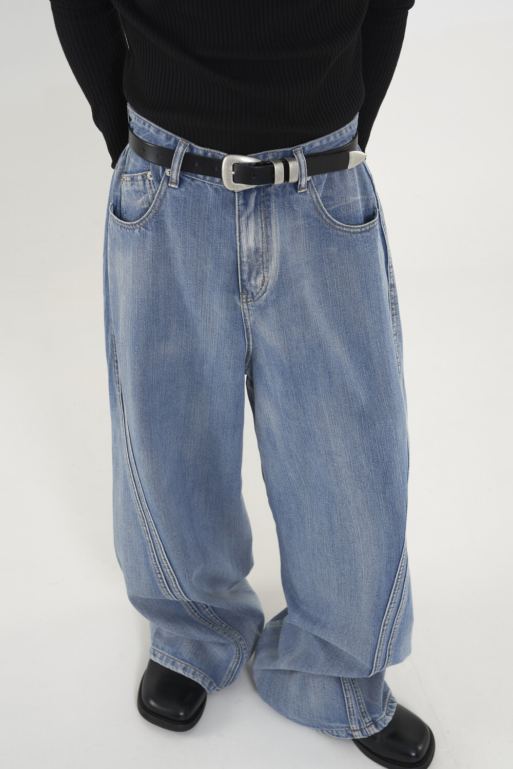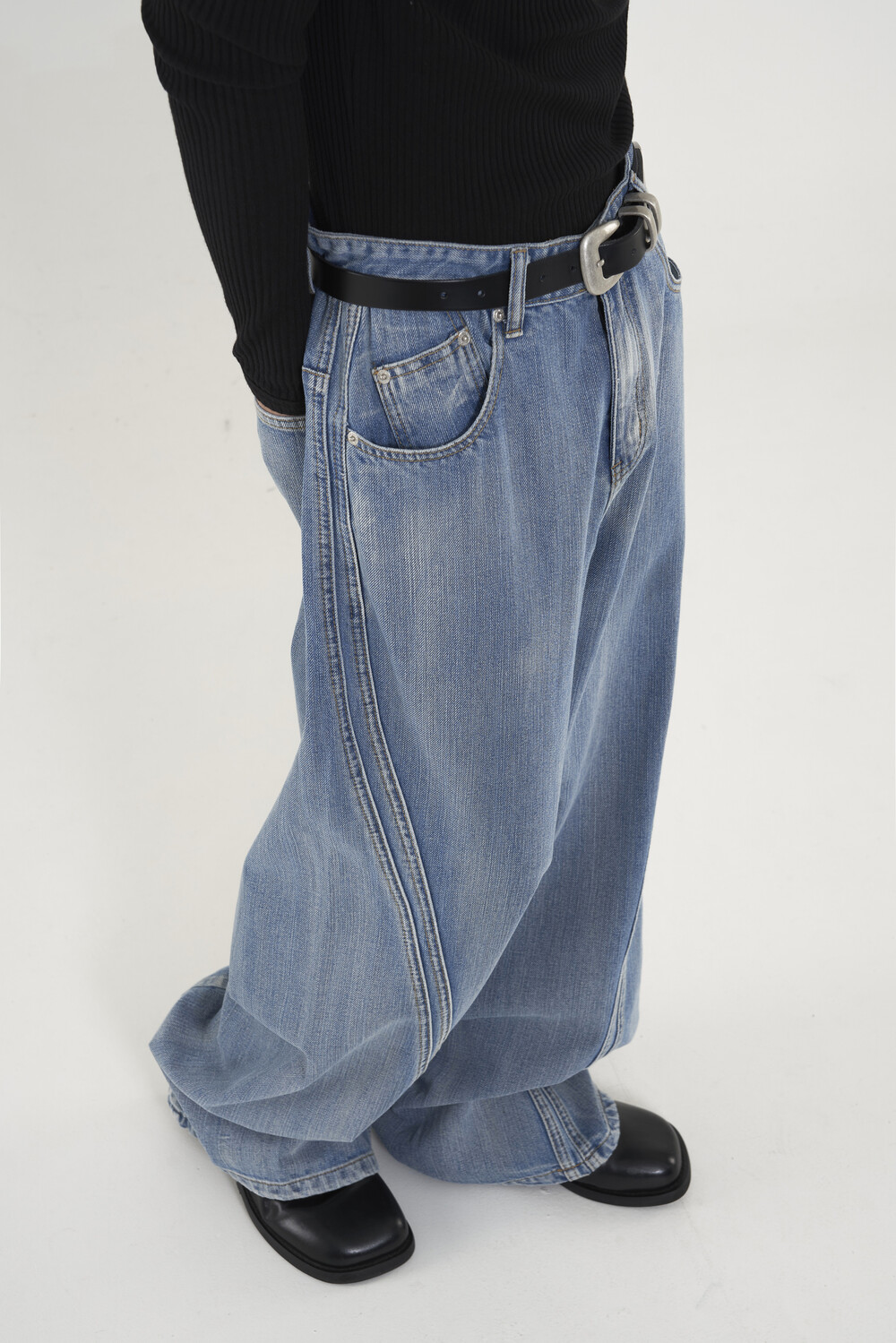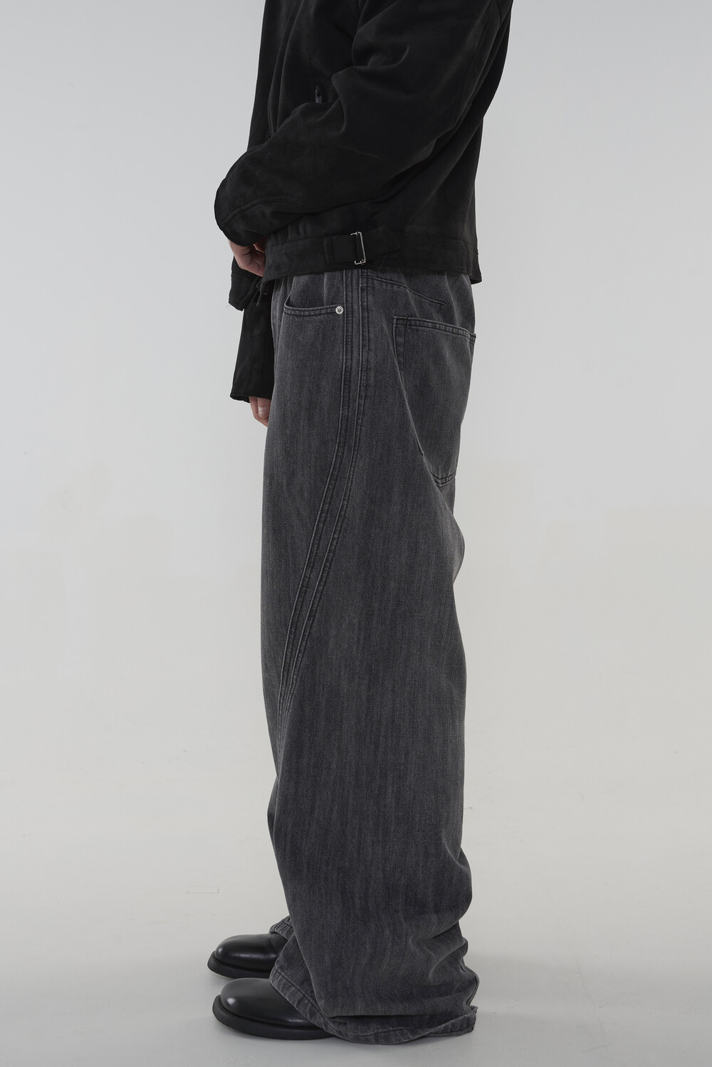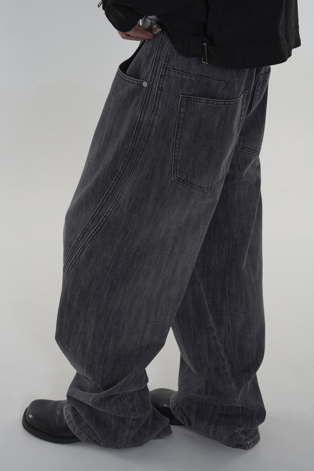 위치시켜 만들어진 커브드 데님 팬츠 제품