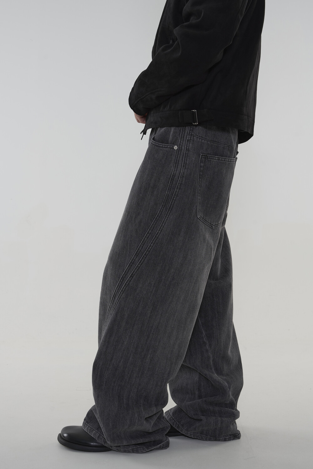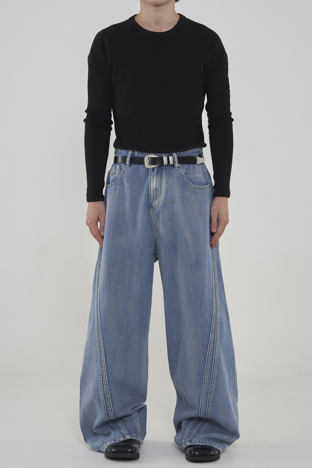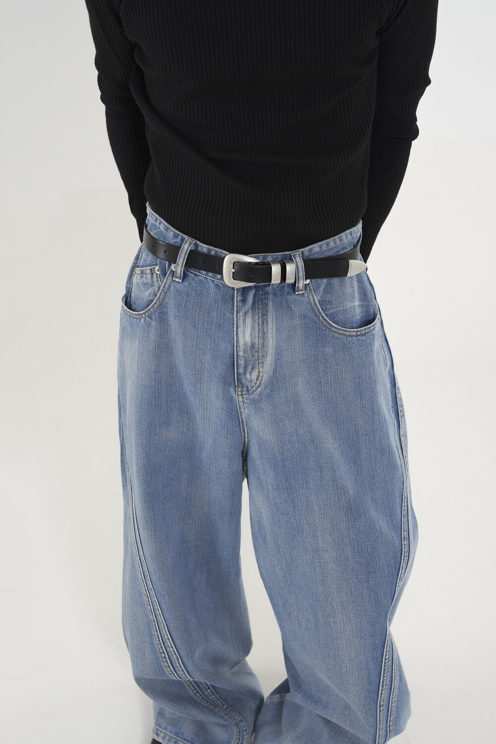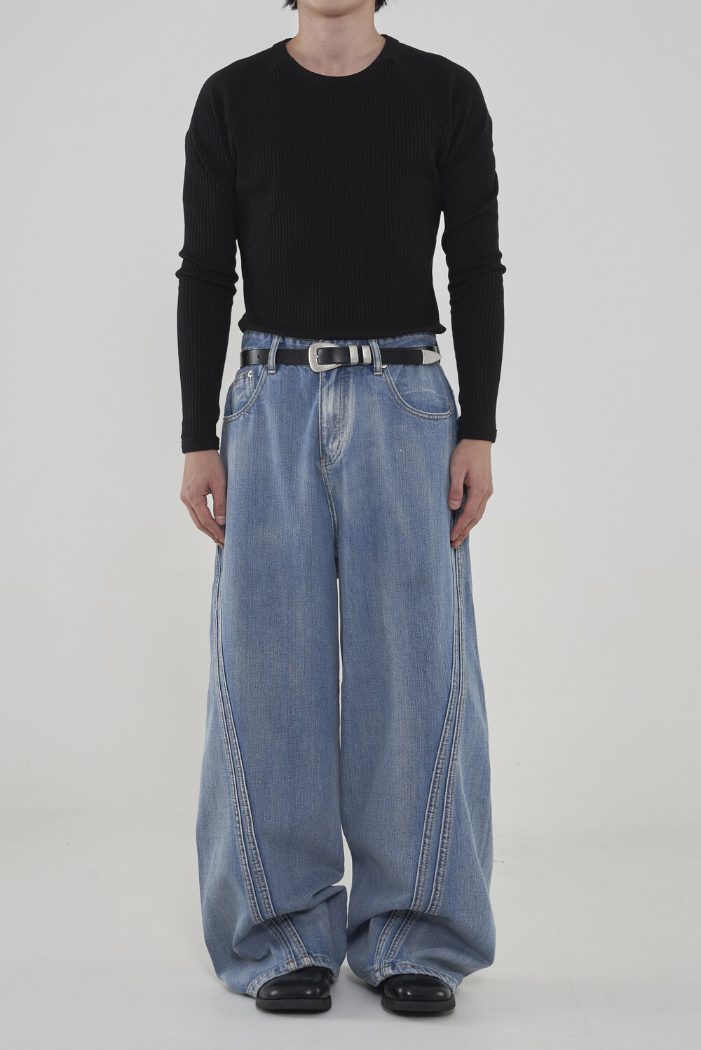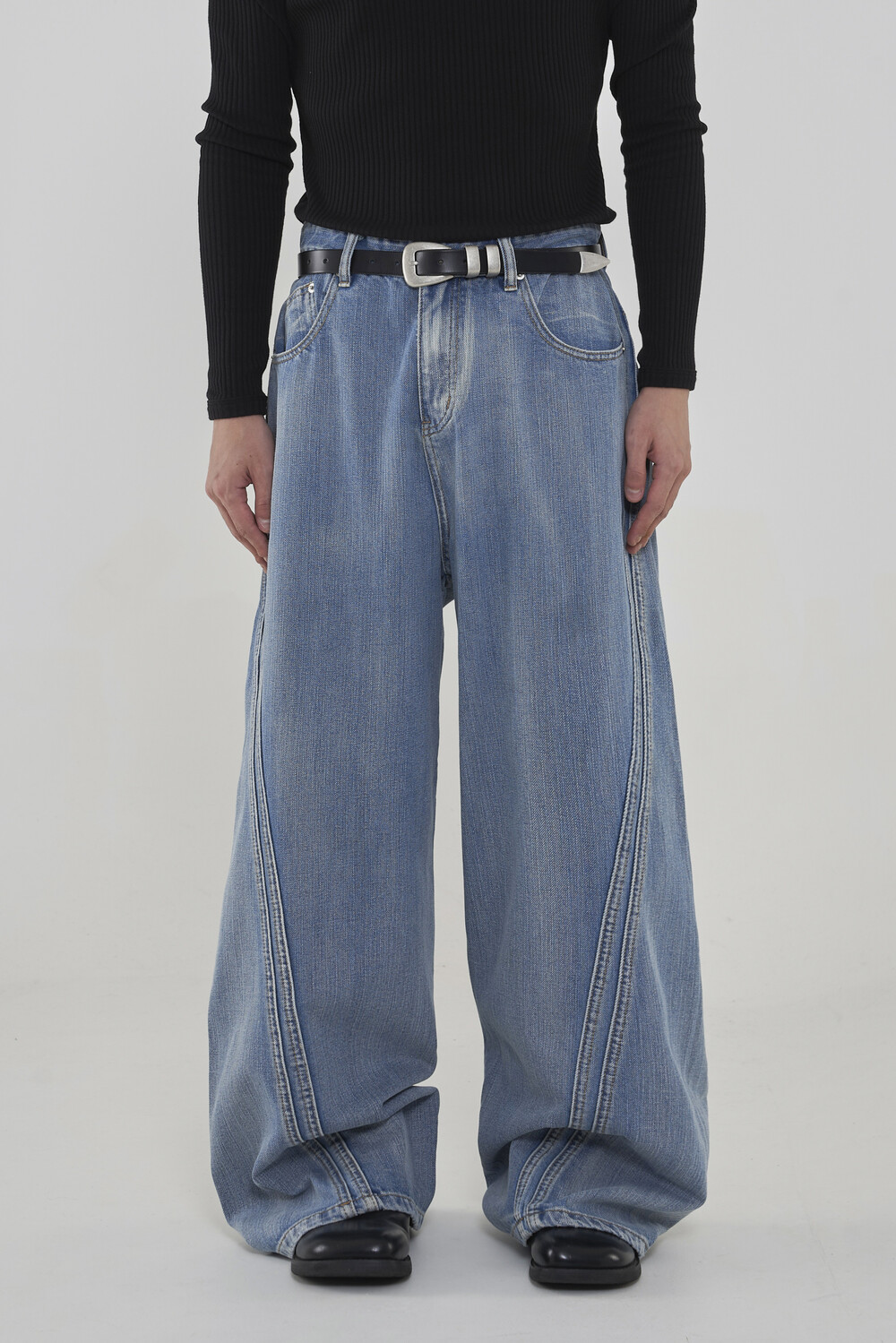 위치시켜 만들어진 커브드 데님 팬츠 제품