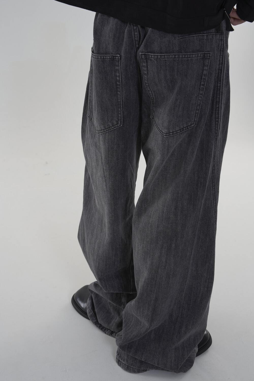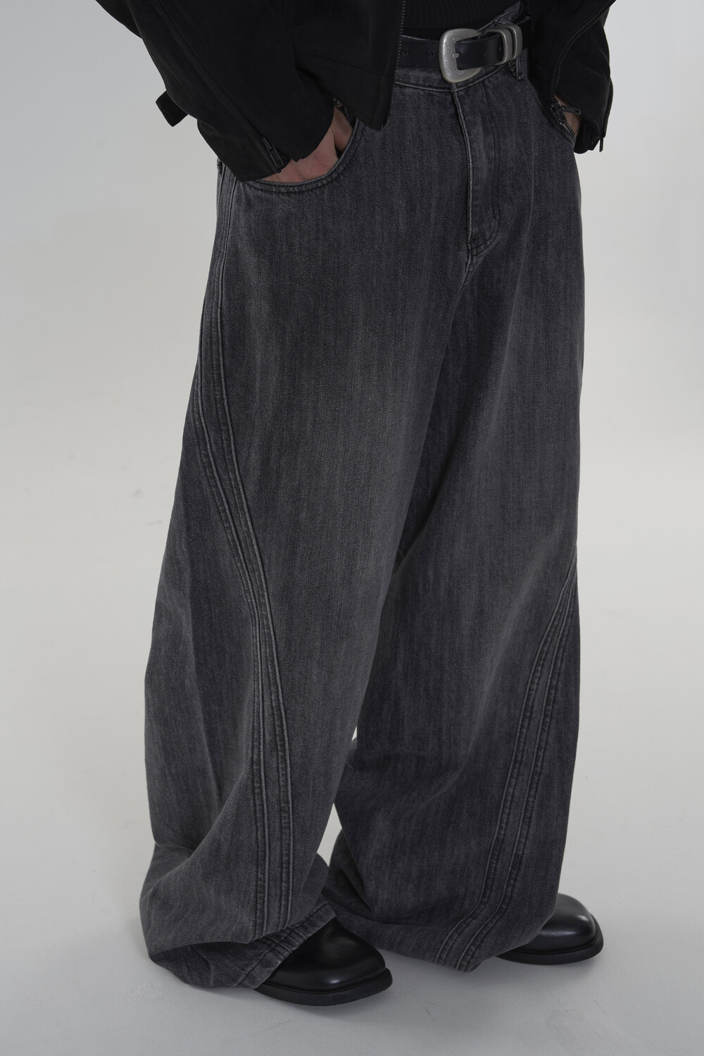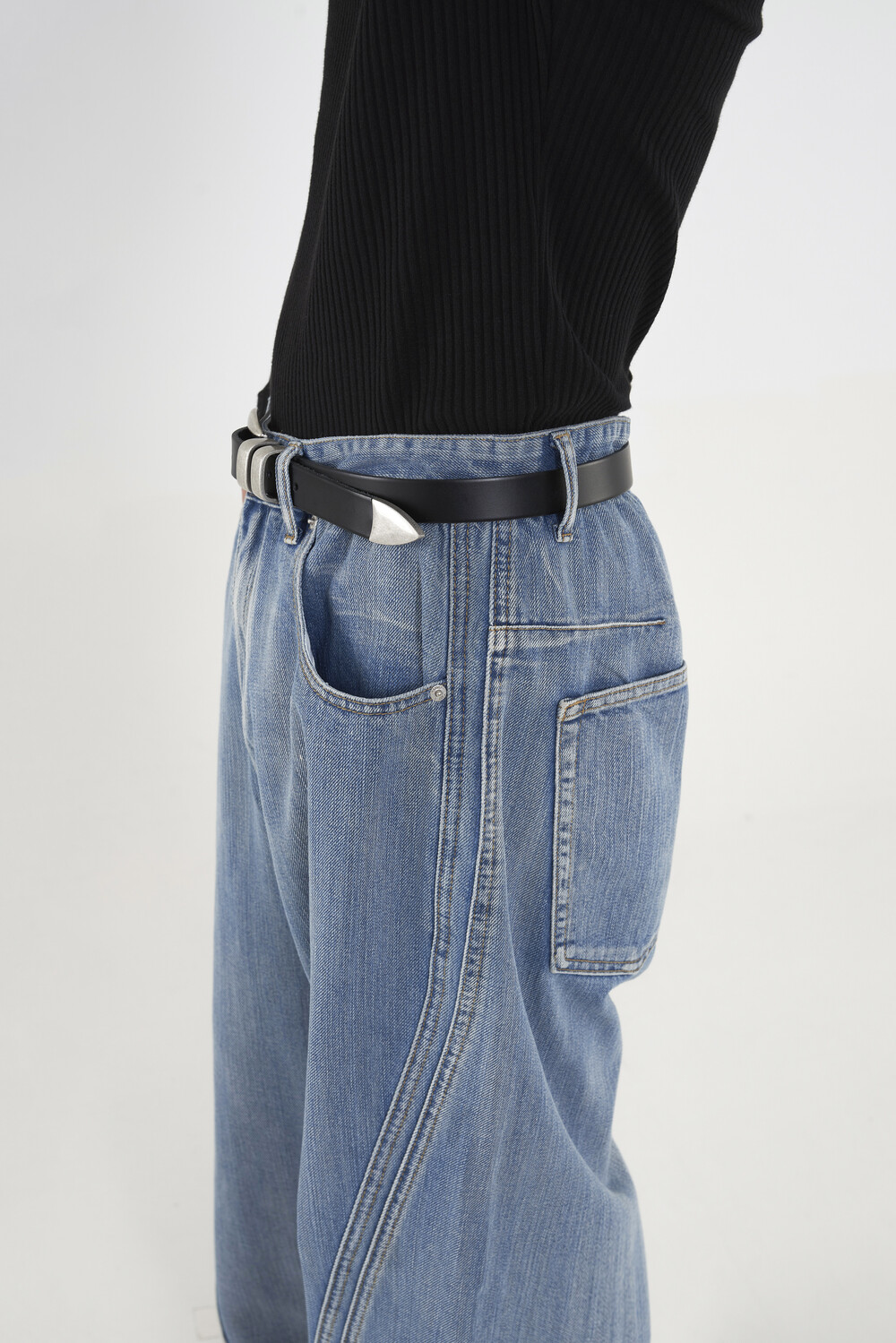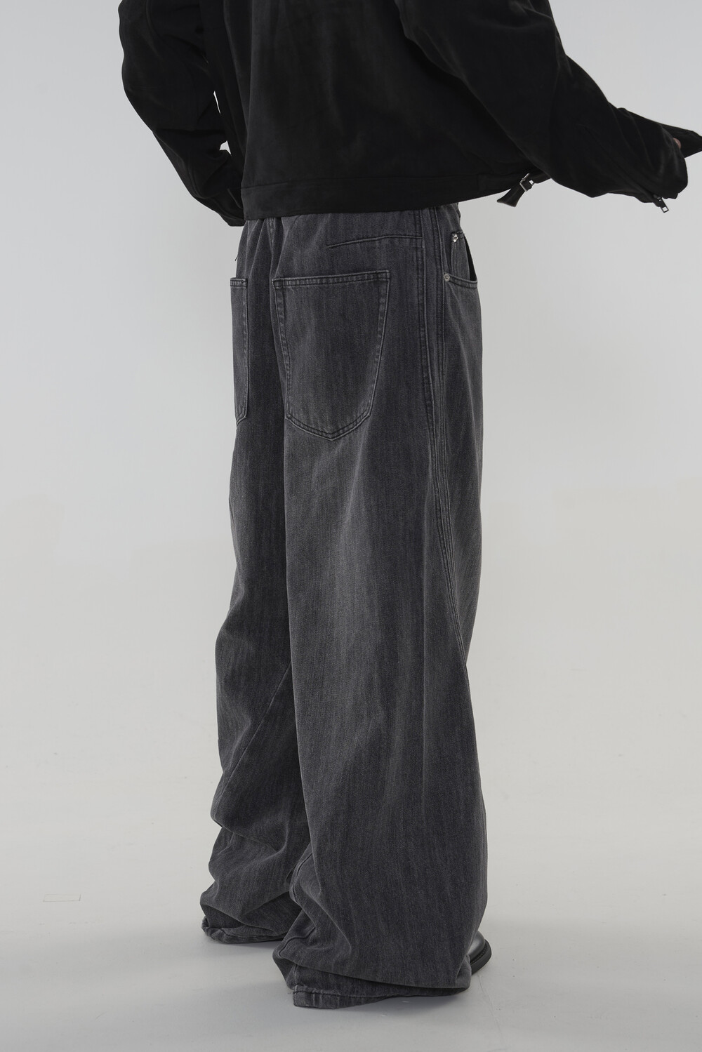 위치시켜 만들어진 커브드 데님 팬츠 제품