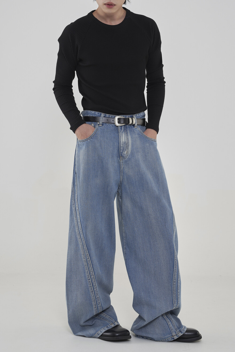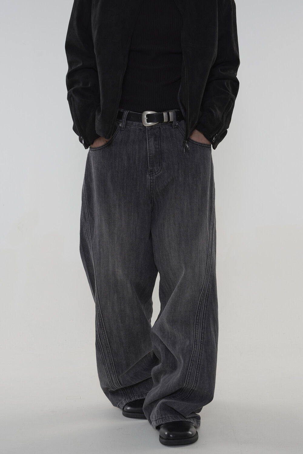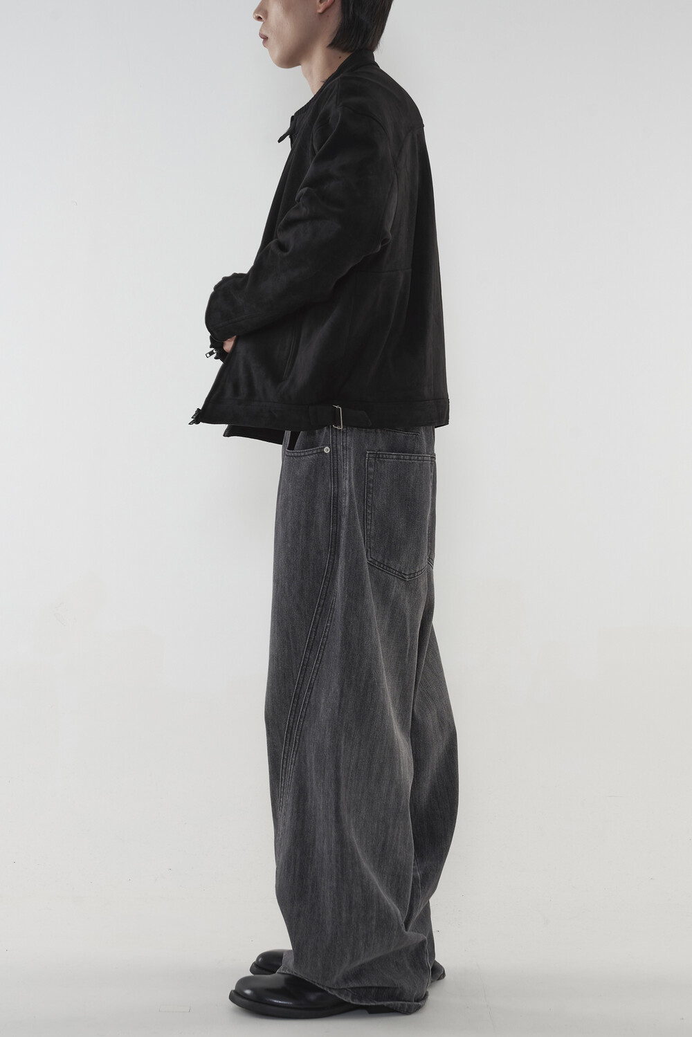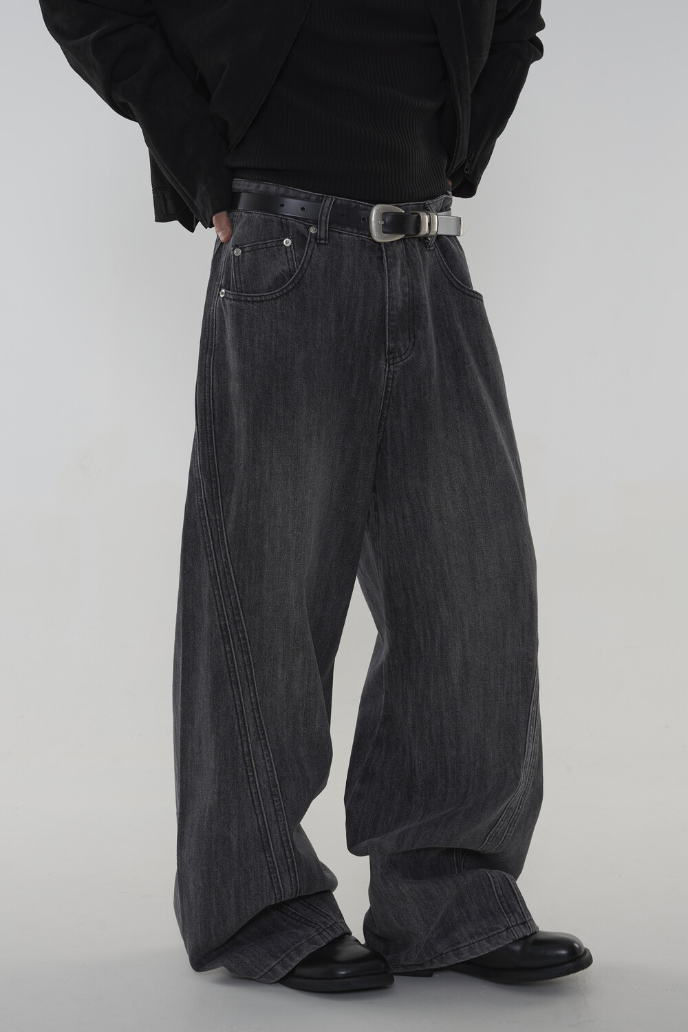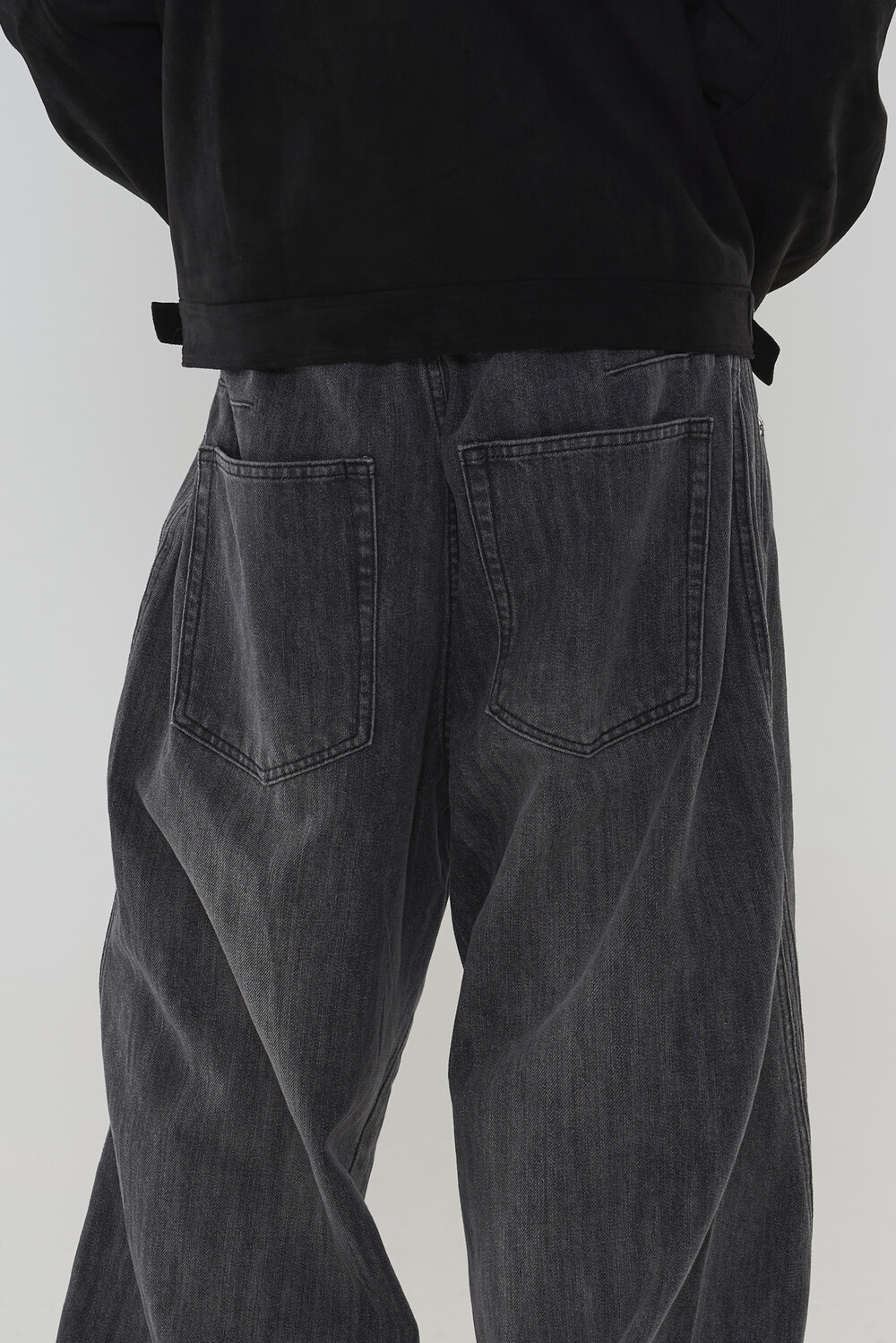 위치시켜 만들어진 커브드 데님 팬츠 제품