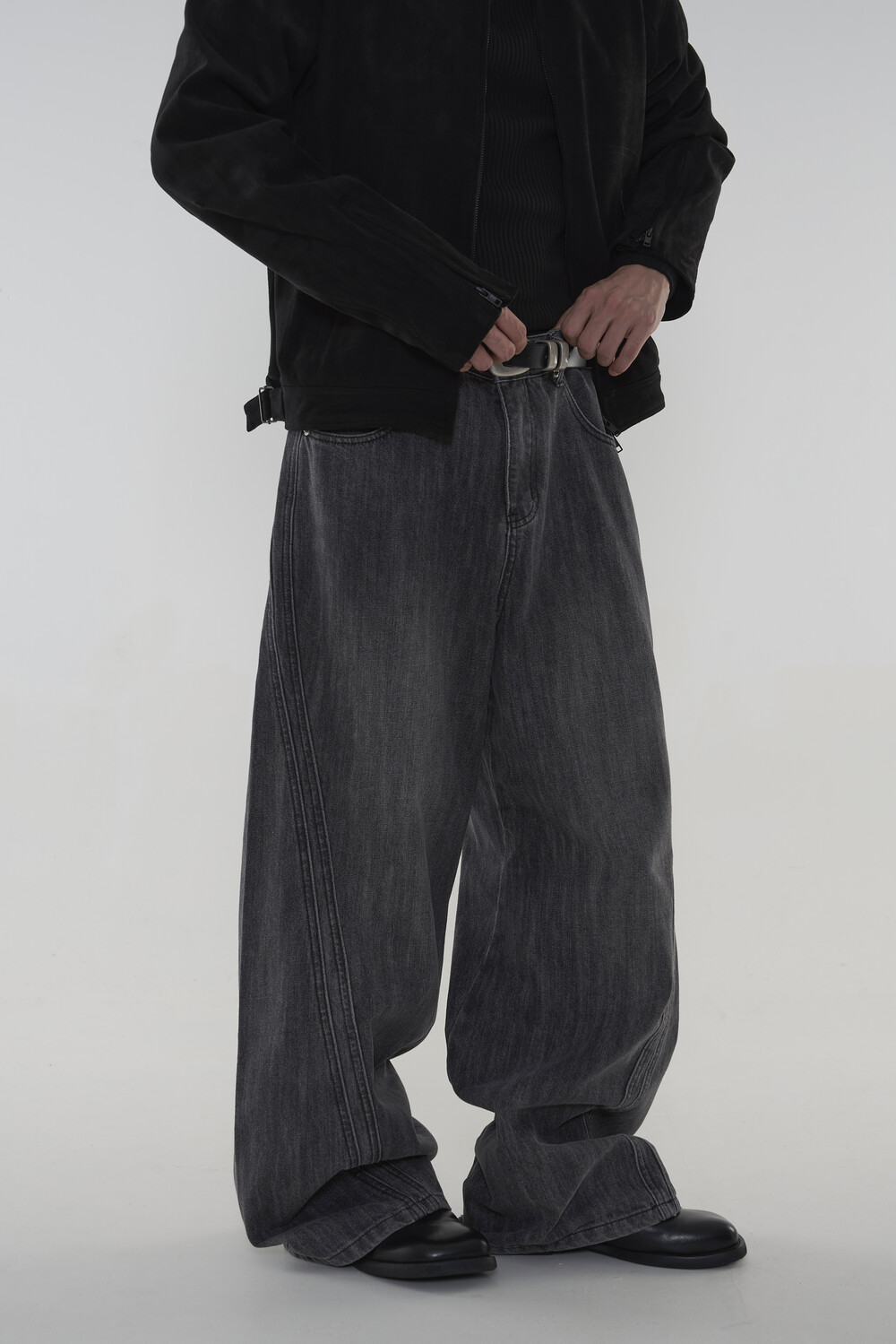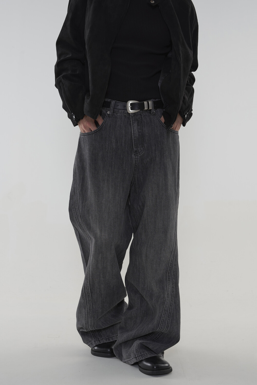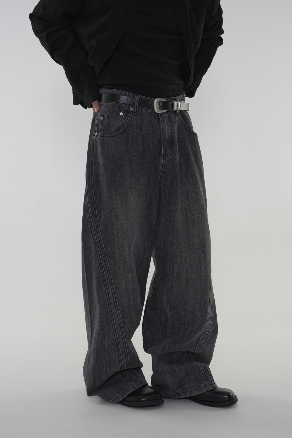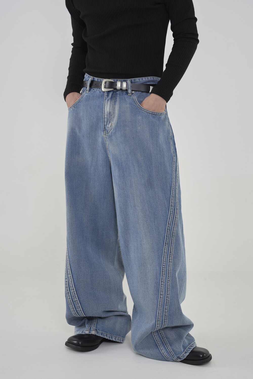 위치시켜 만들어진 커브드 데님 팬츠 제품