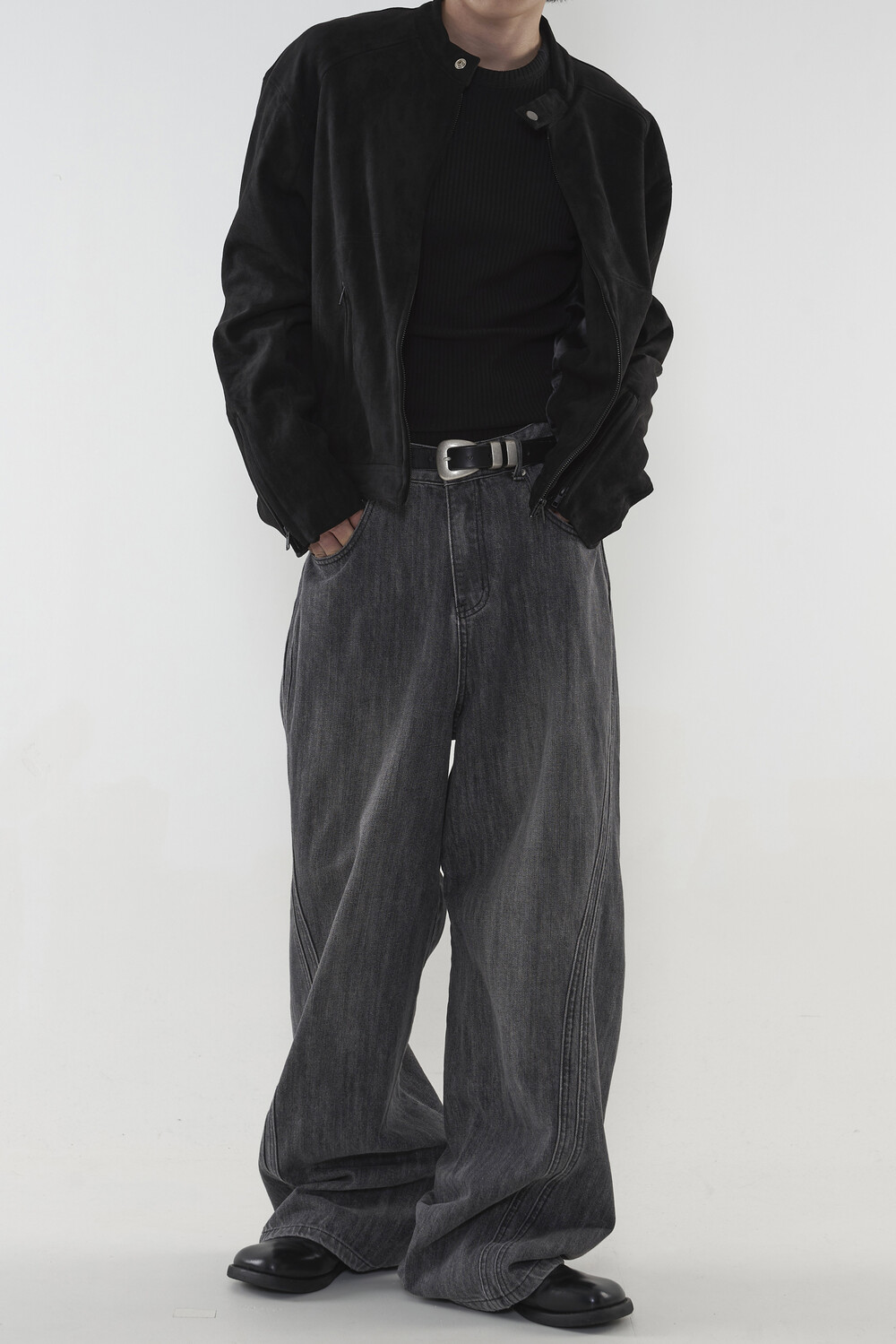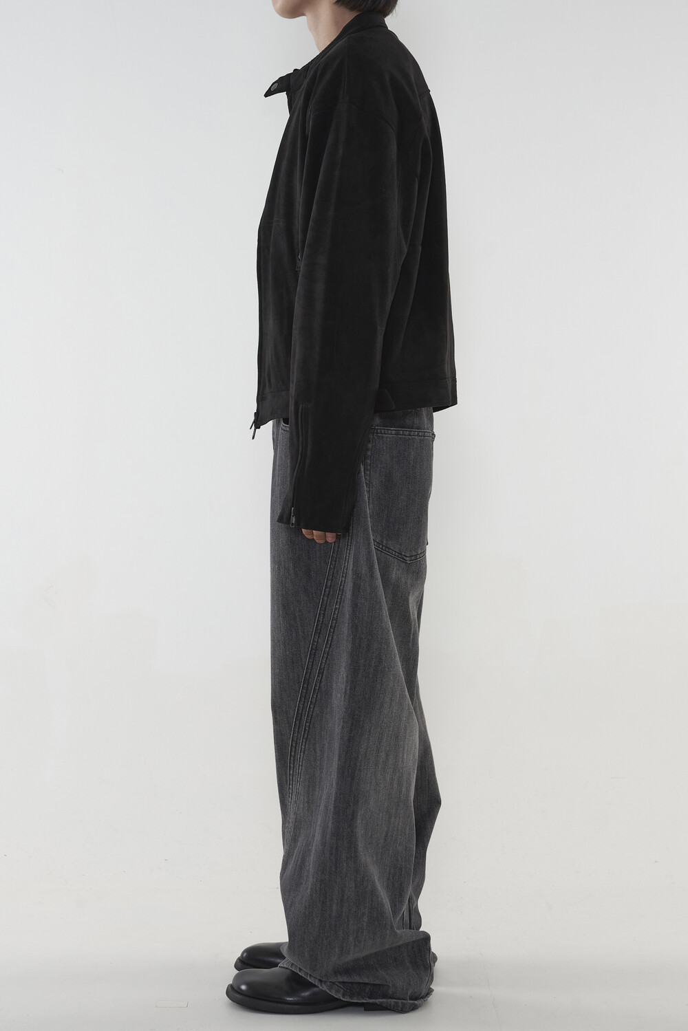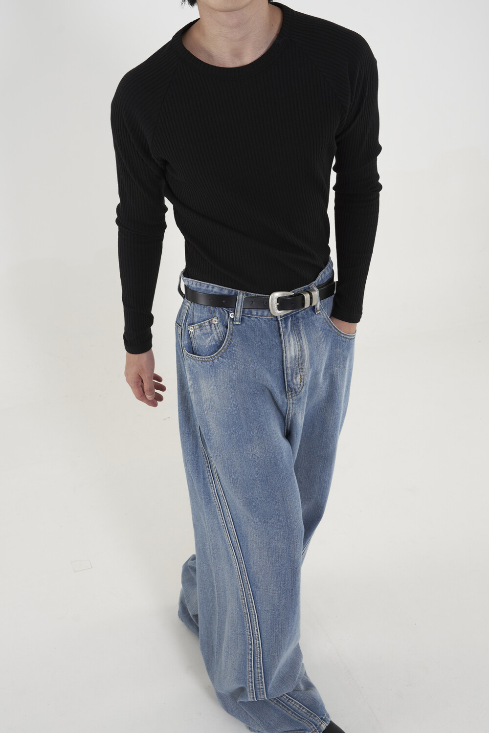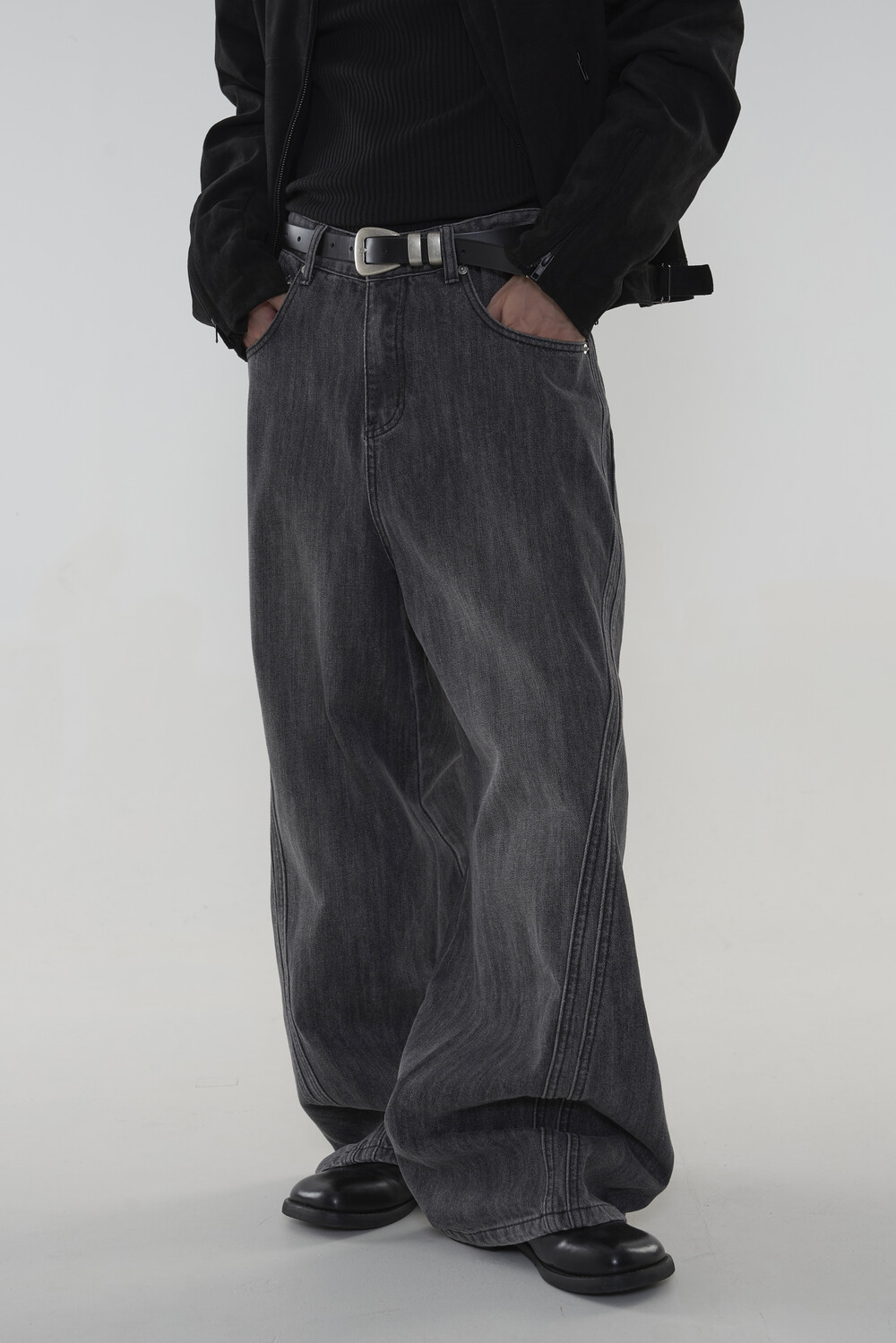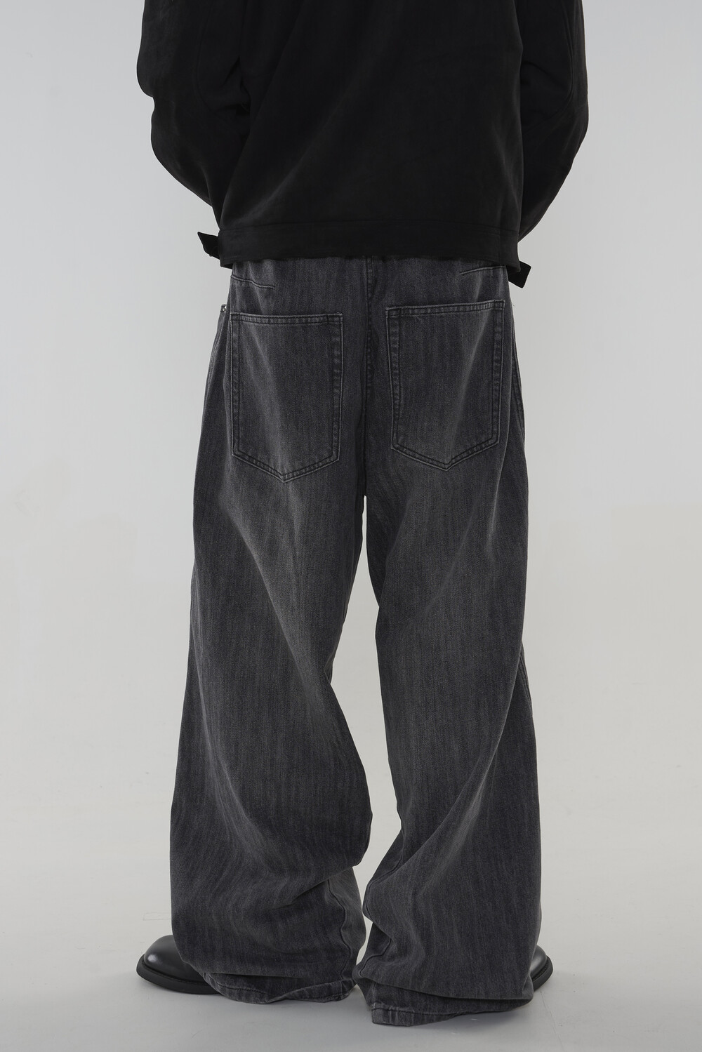 위치시켜 만들어진 커브드 데님 팬츠 제품