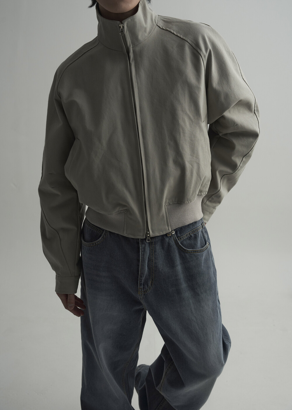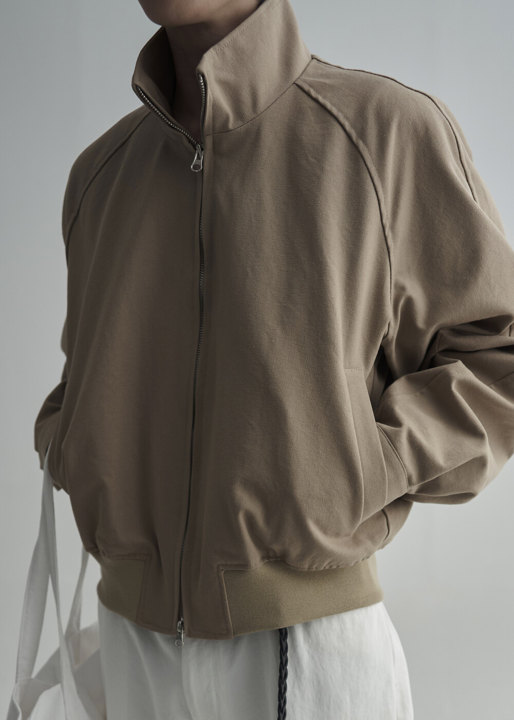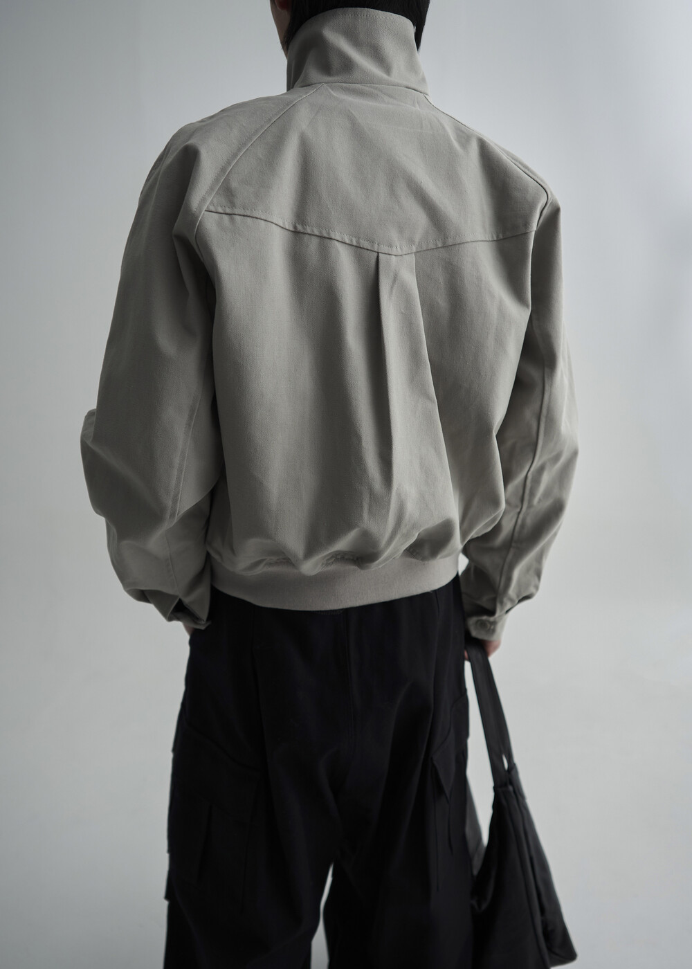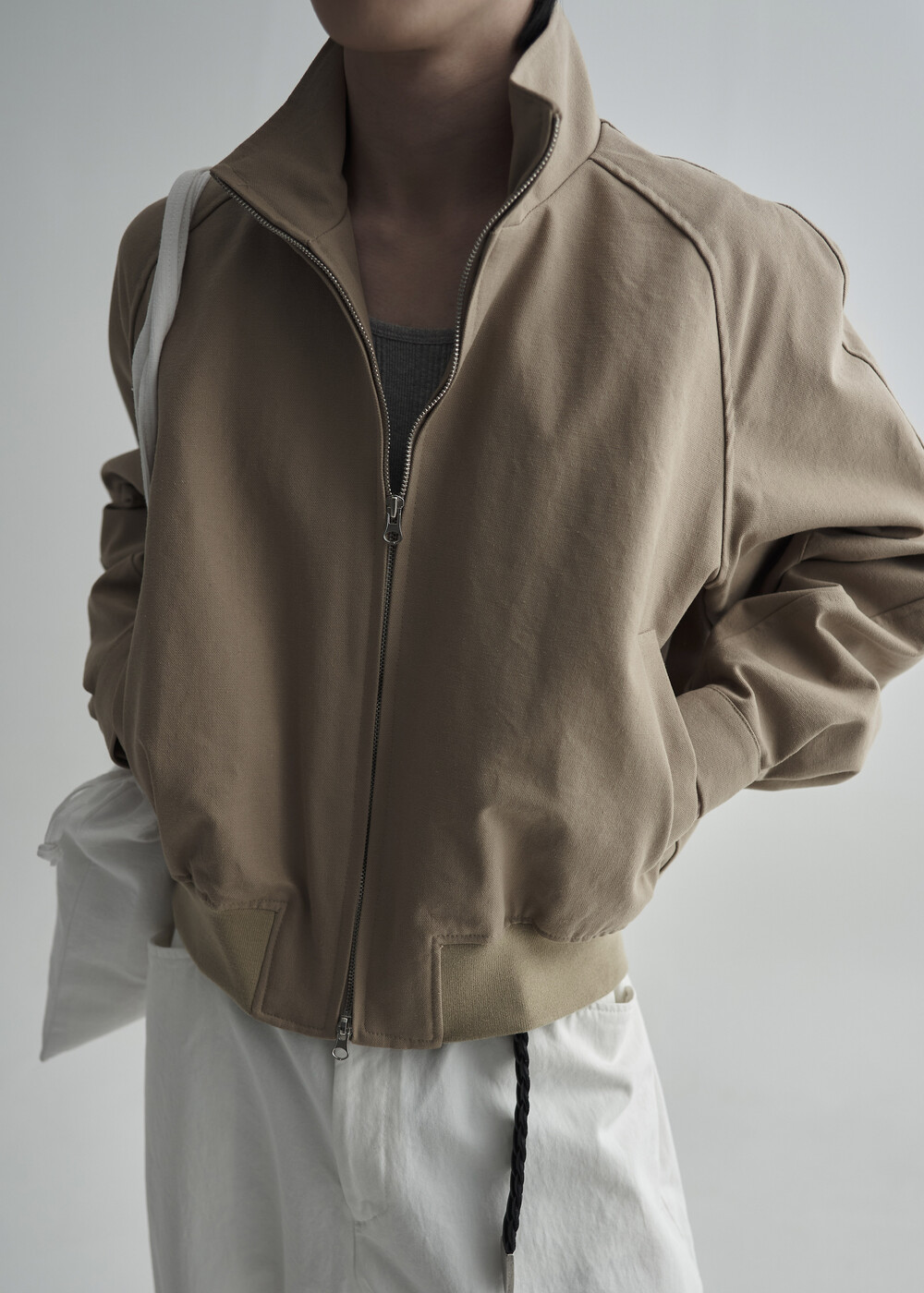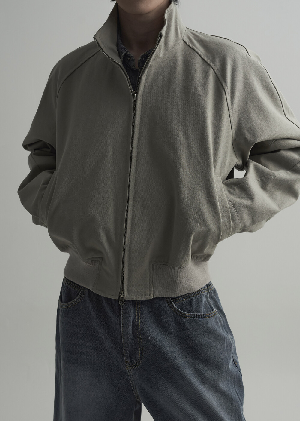 견고한 코튼 소재감으로 편성되어 탄탄한 착용감을 보여주는 하이넥 밴딩 크롭 자켓 제품입니다.