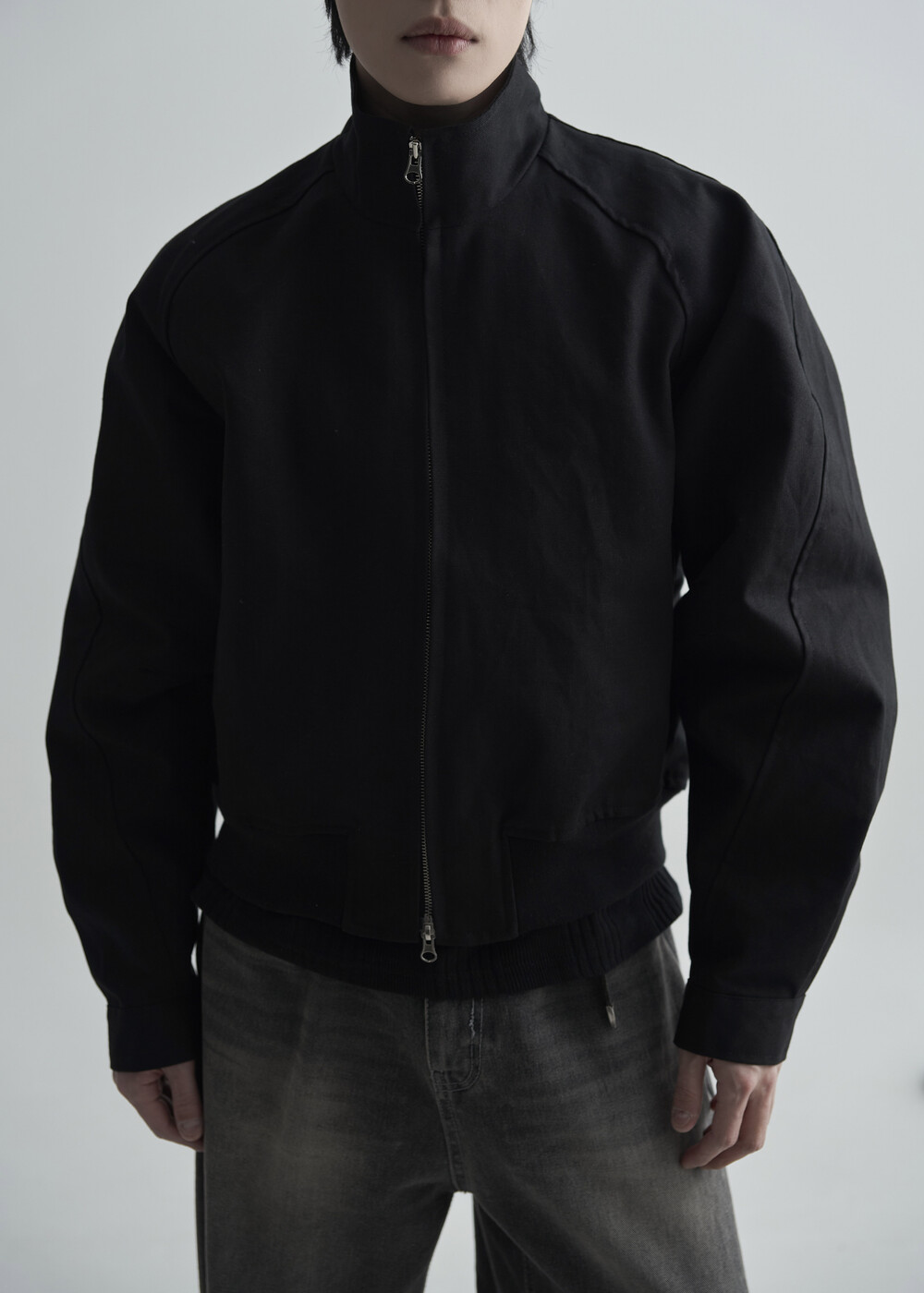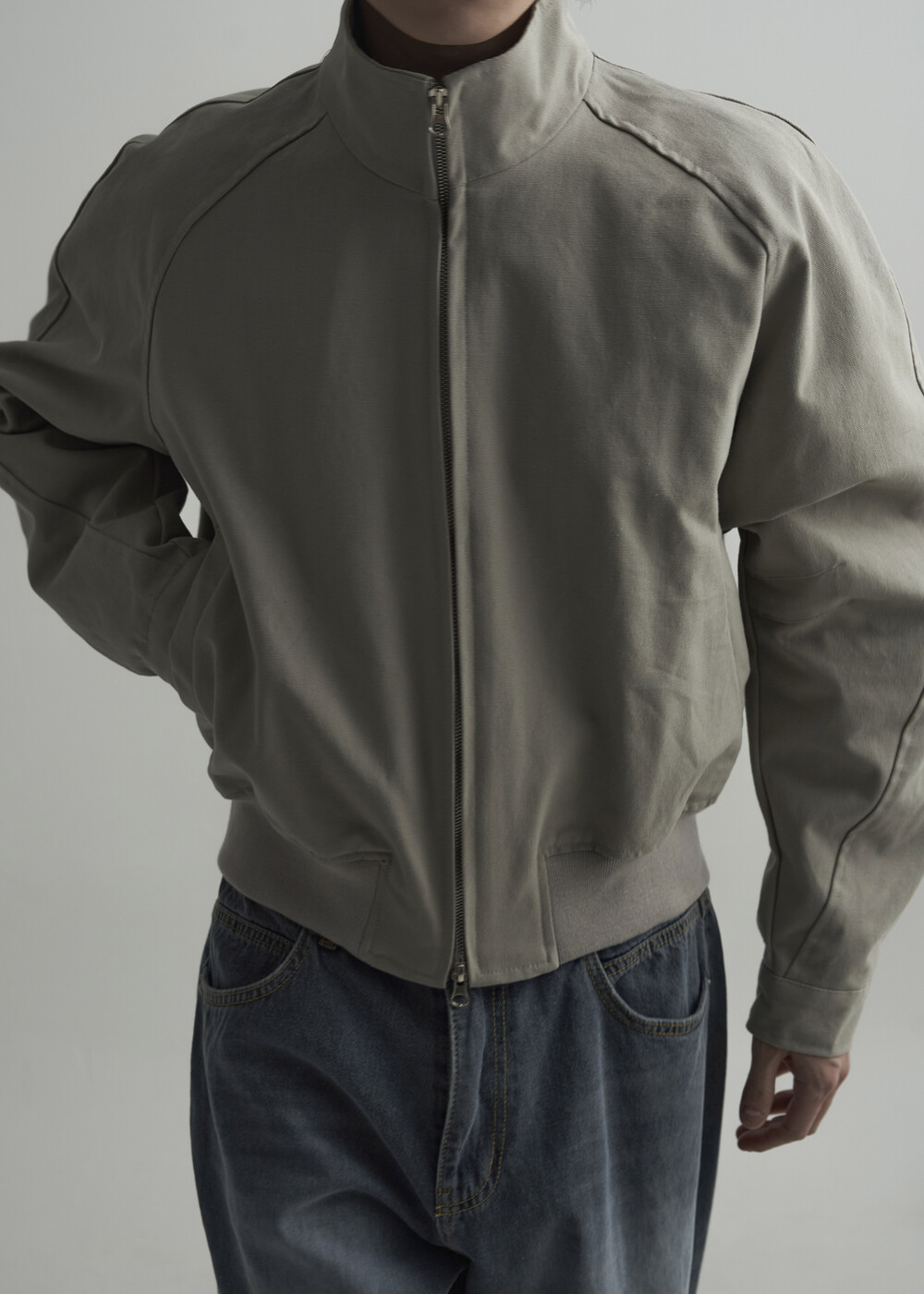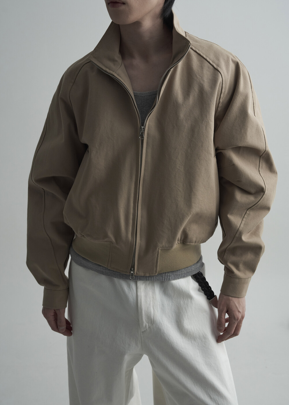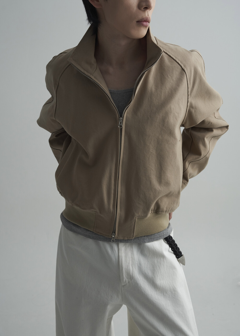견고한 코튼 소재감으로 편성되어 탄탄한 착용감을 보여주는 하이넥 밴딩 크롭 자켓 제품입니다.
