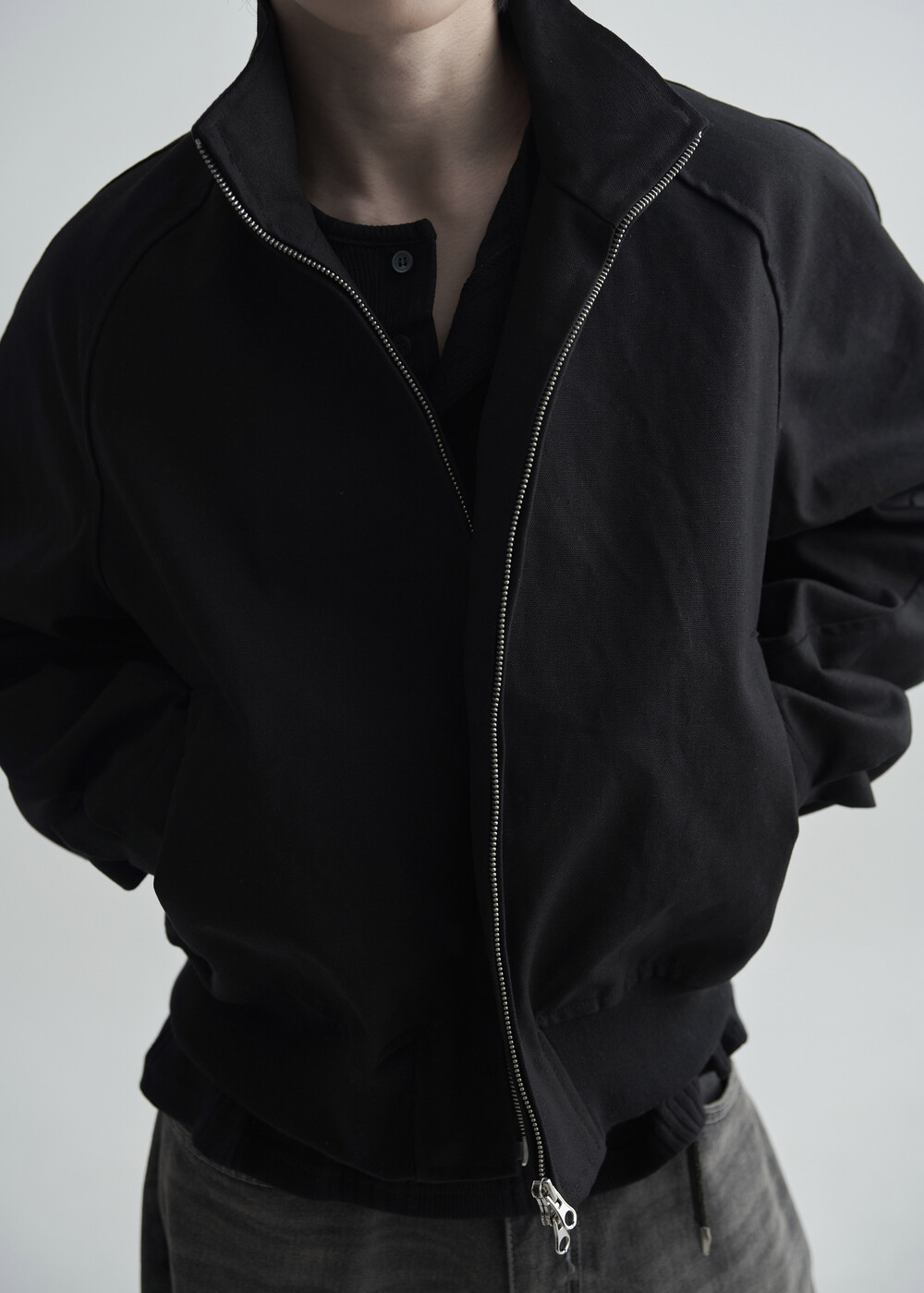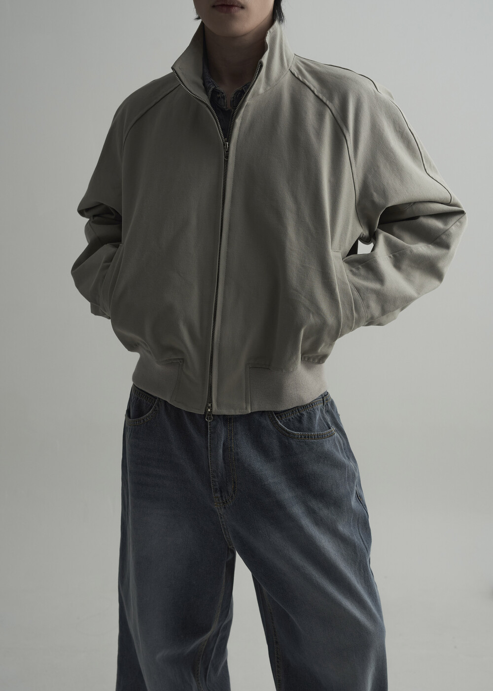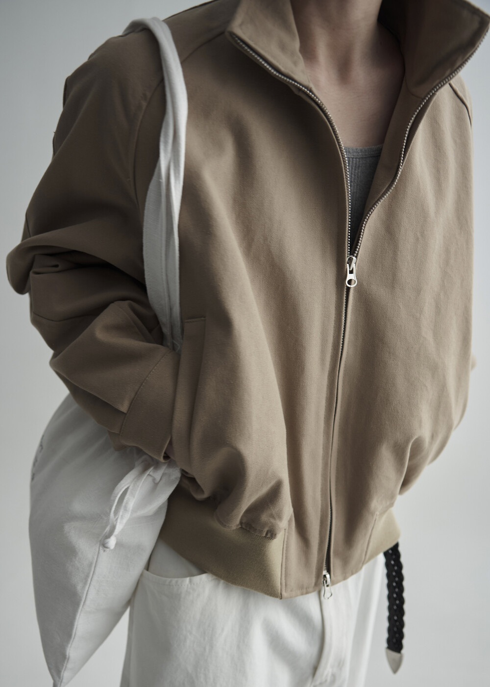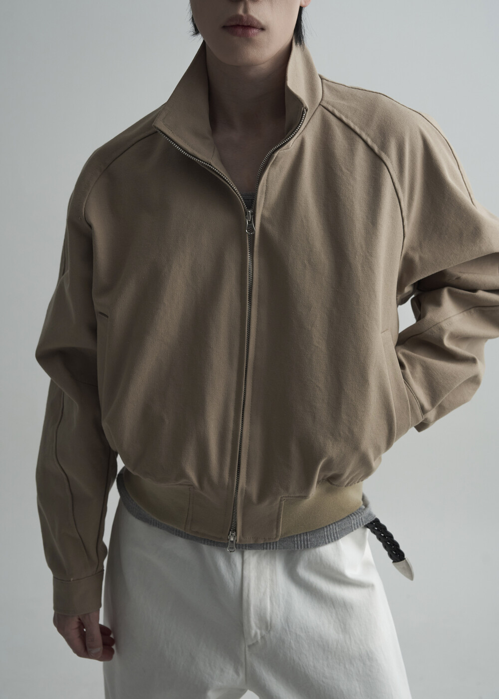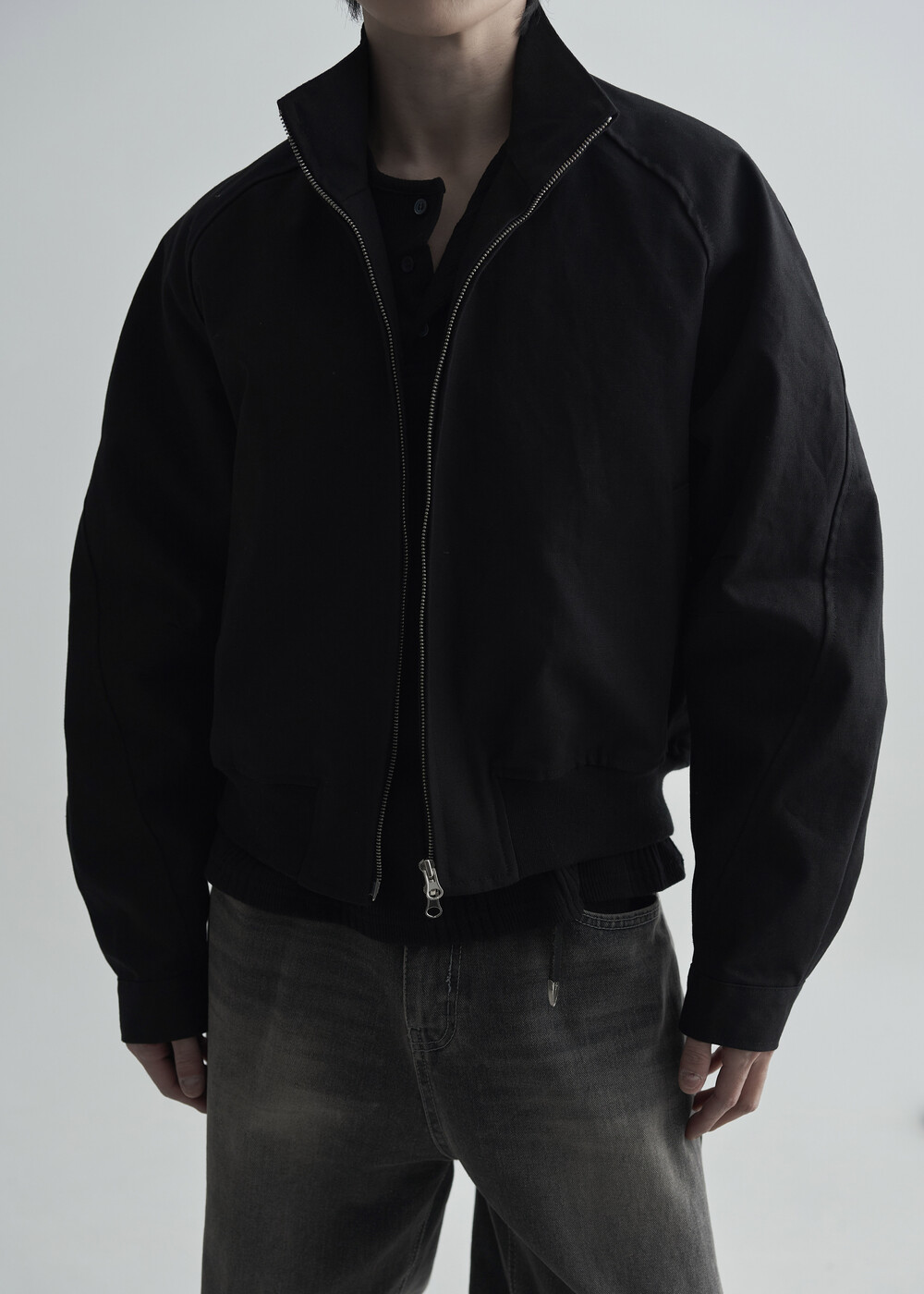 견고한 코튼 소재감으로 편성되어 탄탄한 착용감을 보여주는 하이넥 밴딩 크롭 자켓 제품입니다.