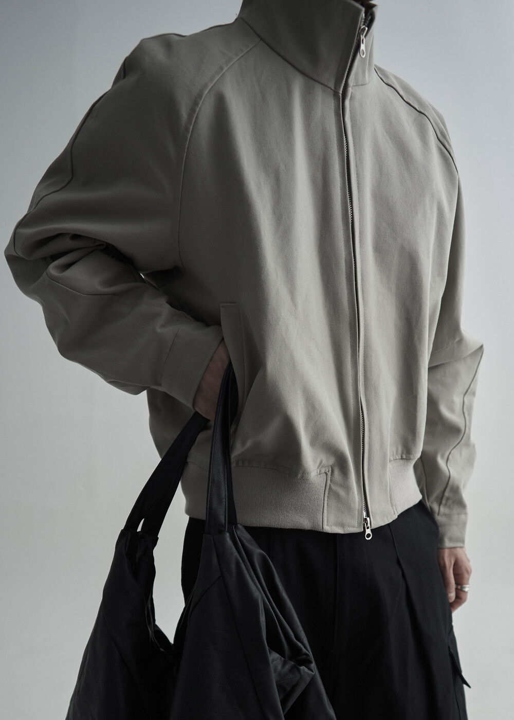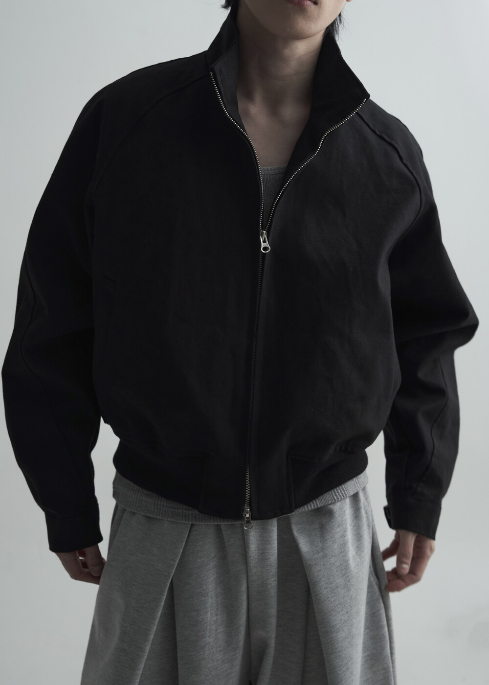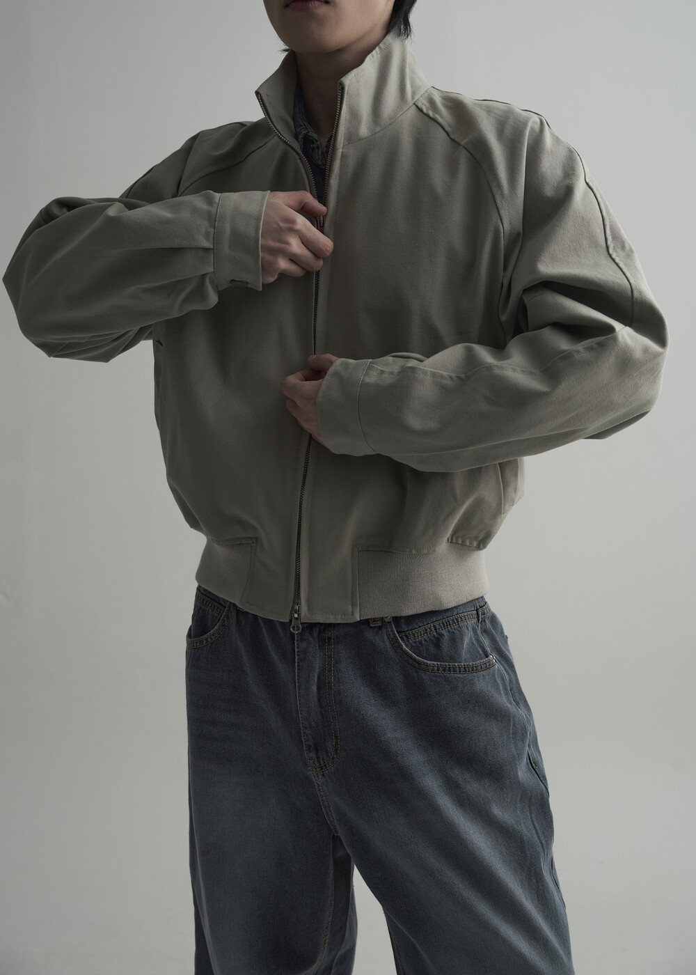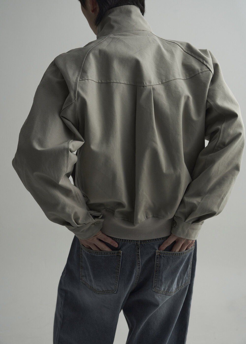 견고한 코튼 소재감으로 편성되어 탄탄한 착용감을 보여주는 하이넥 밴딩 크롭 자켓 제품입니다.