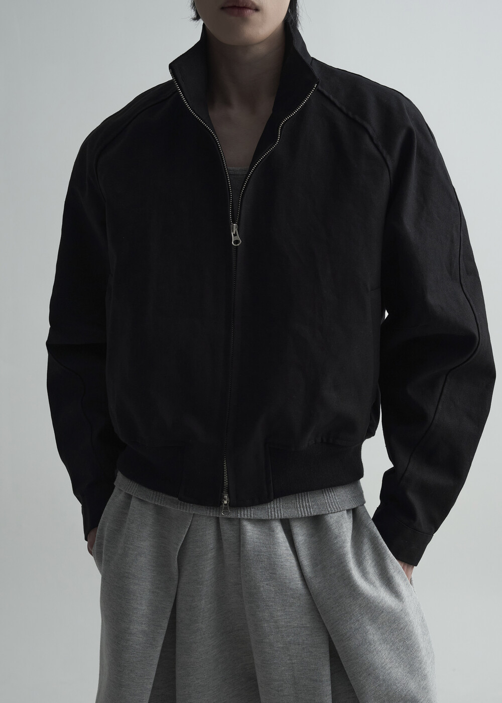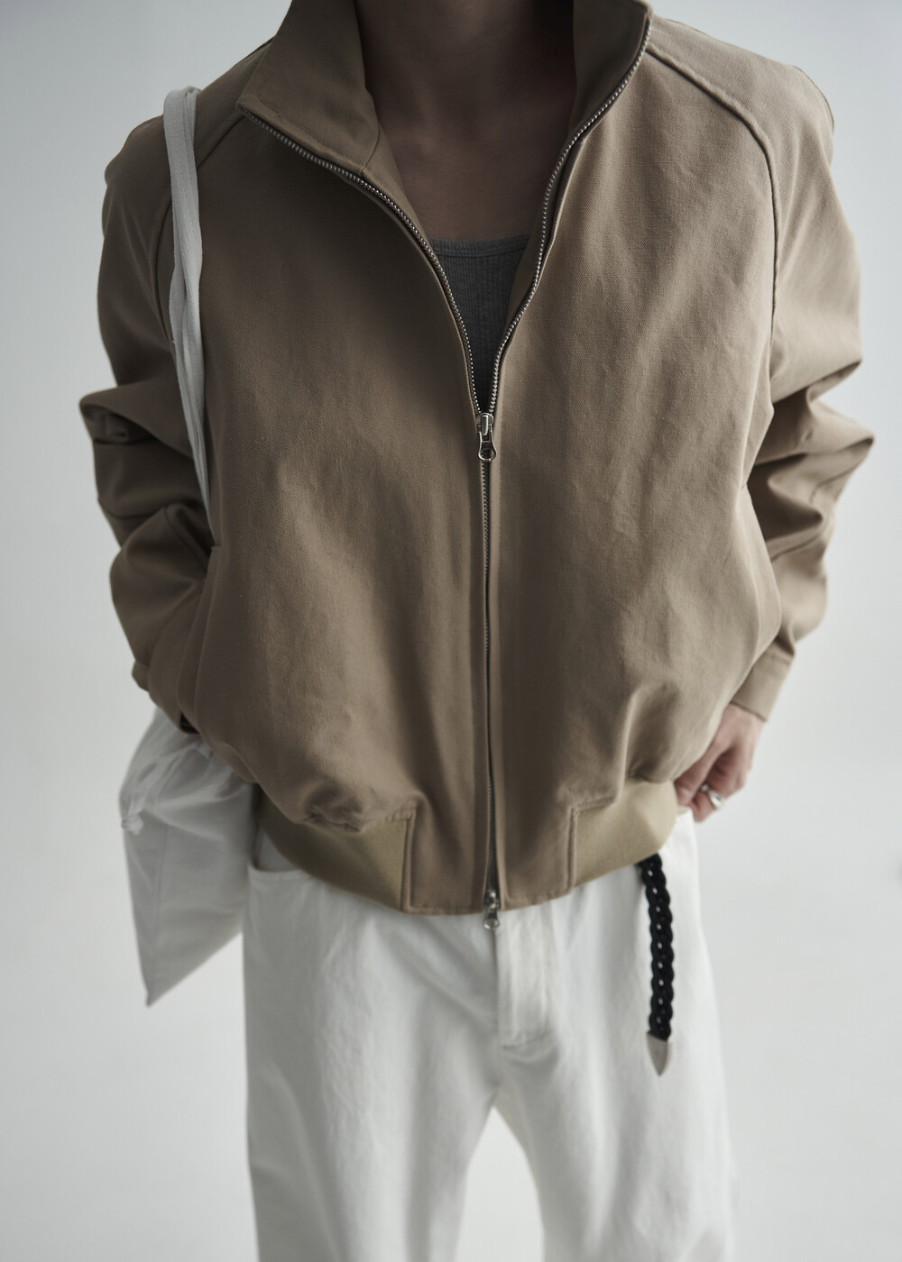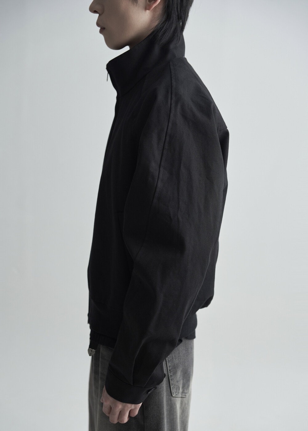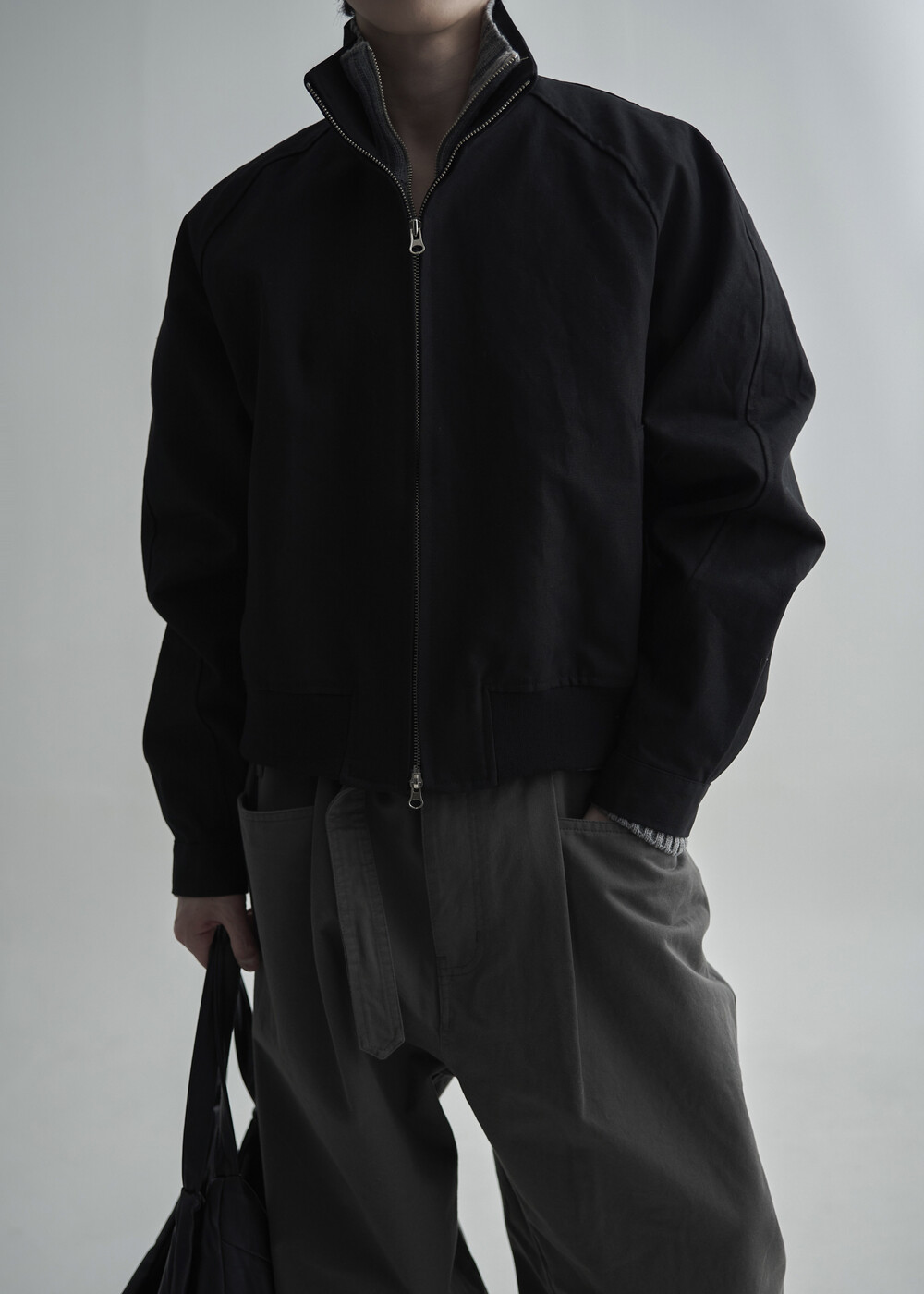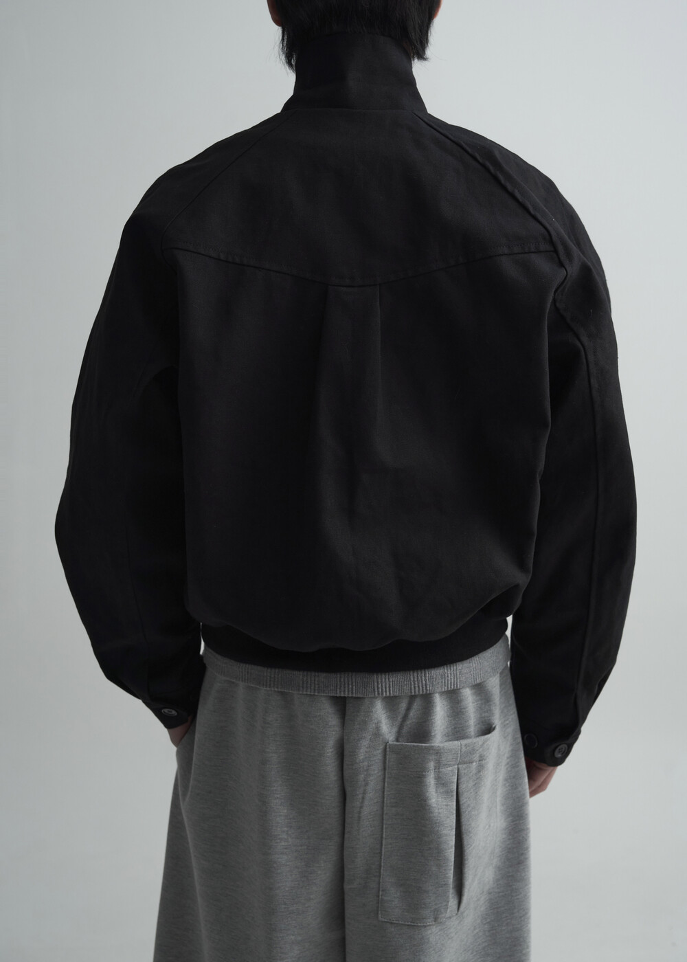 견고한 코튼 소재감으로 편성되어 탄탄한 착용감을 보여주는 하이넥 밴딩 크롭 자켓 제품입니다.