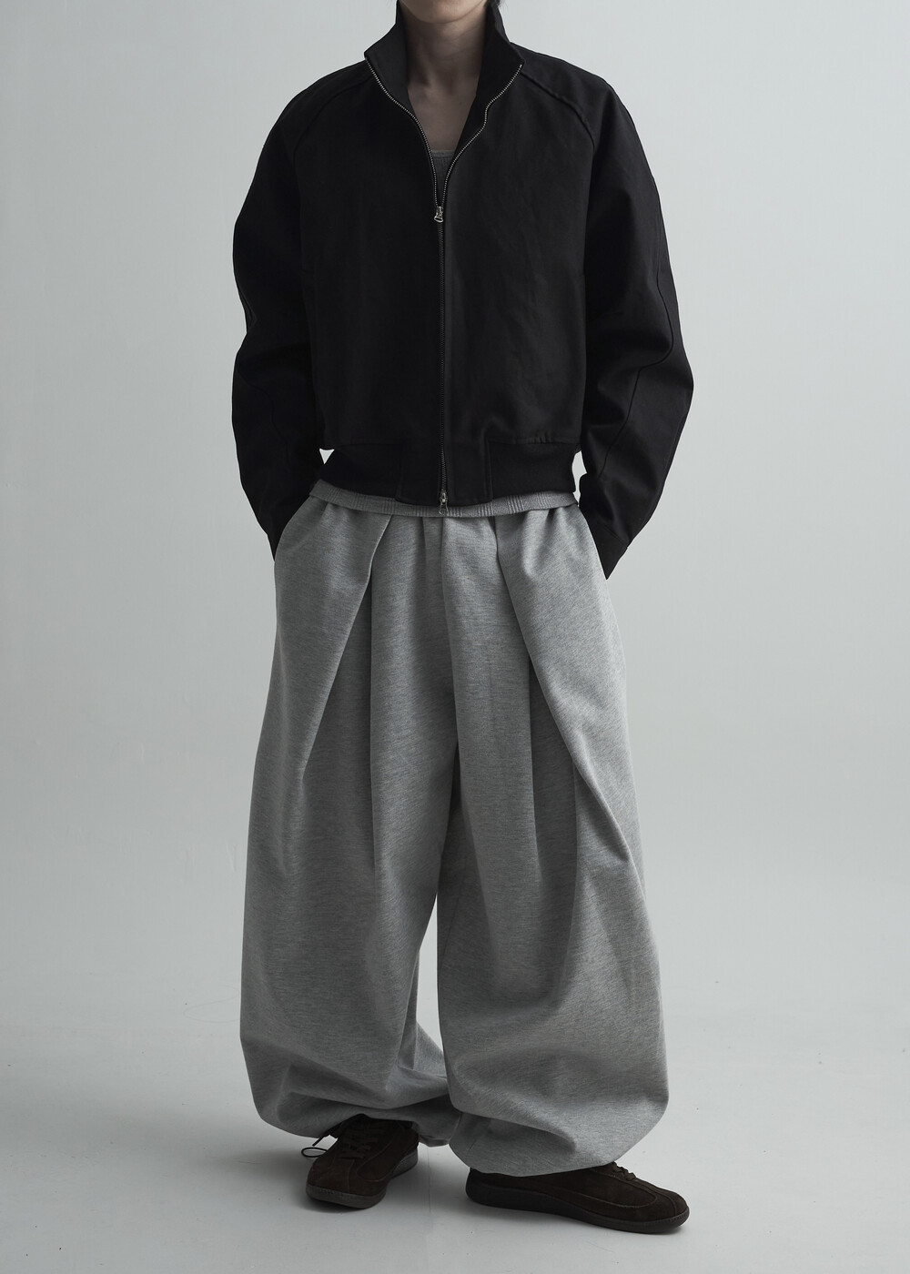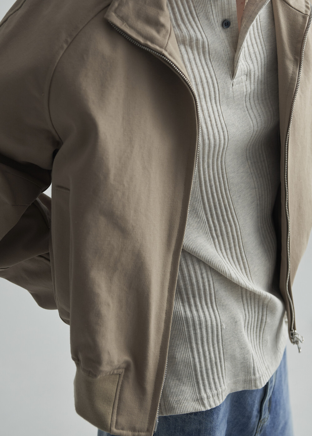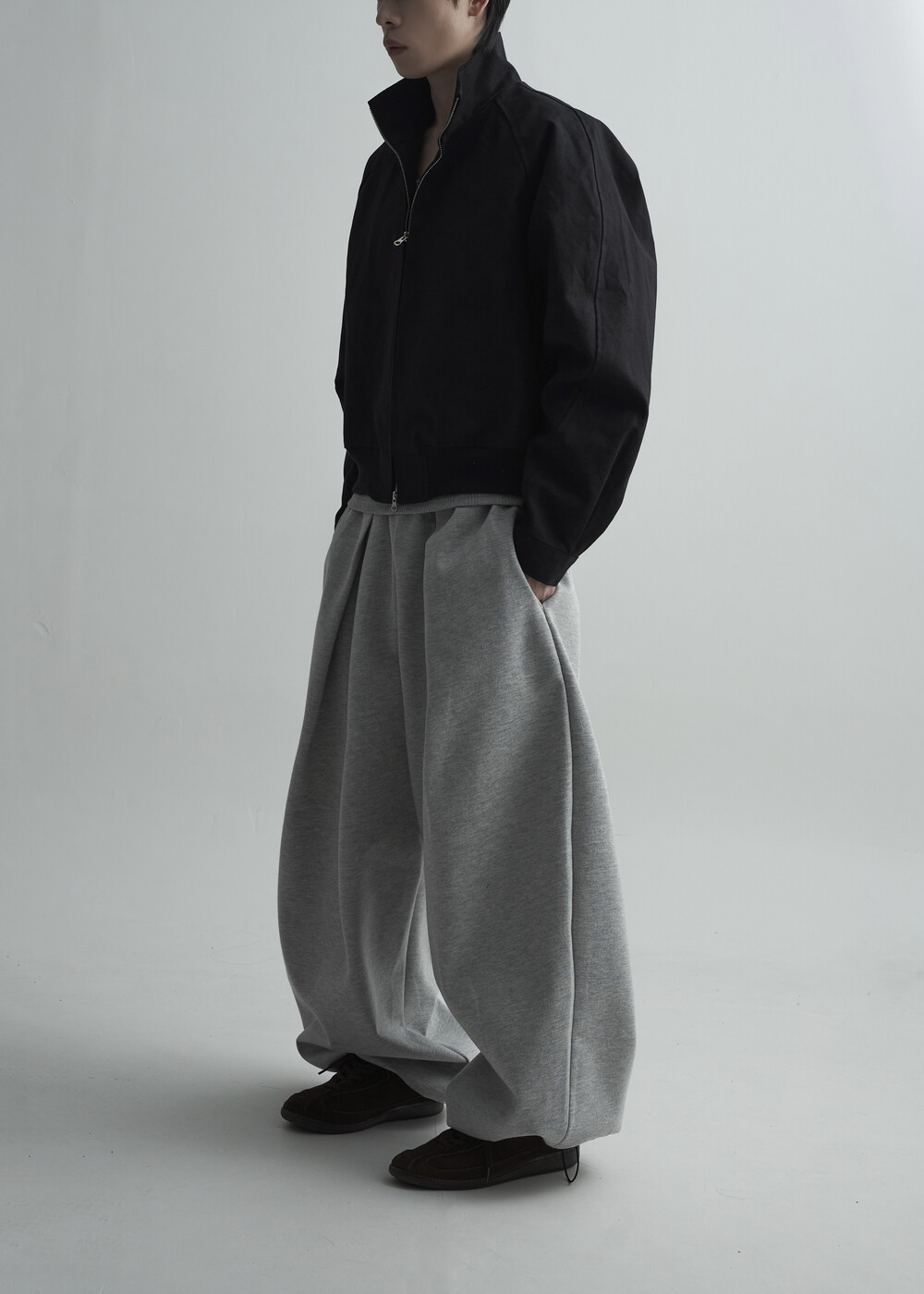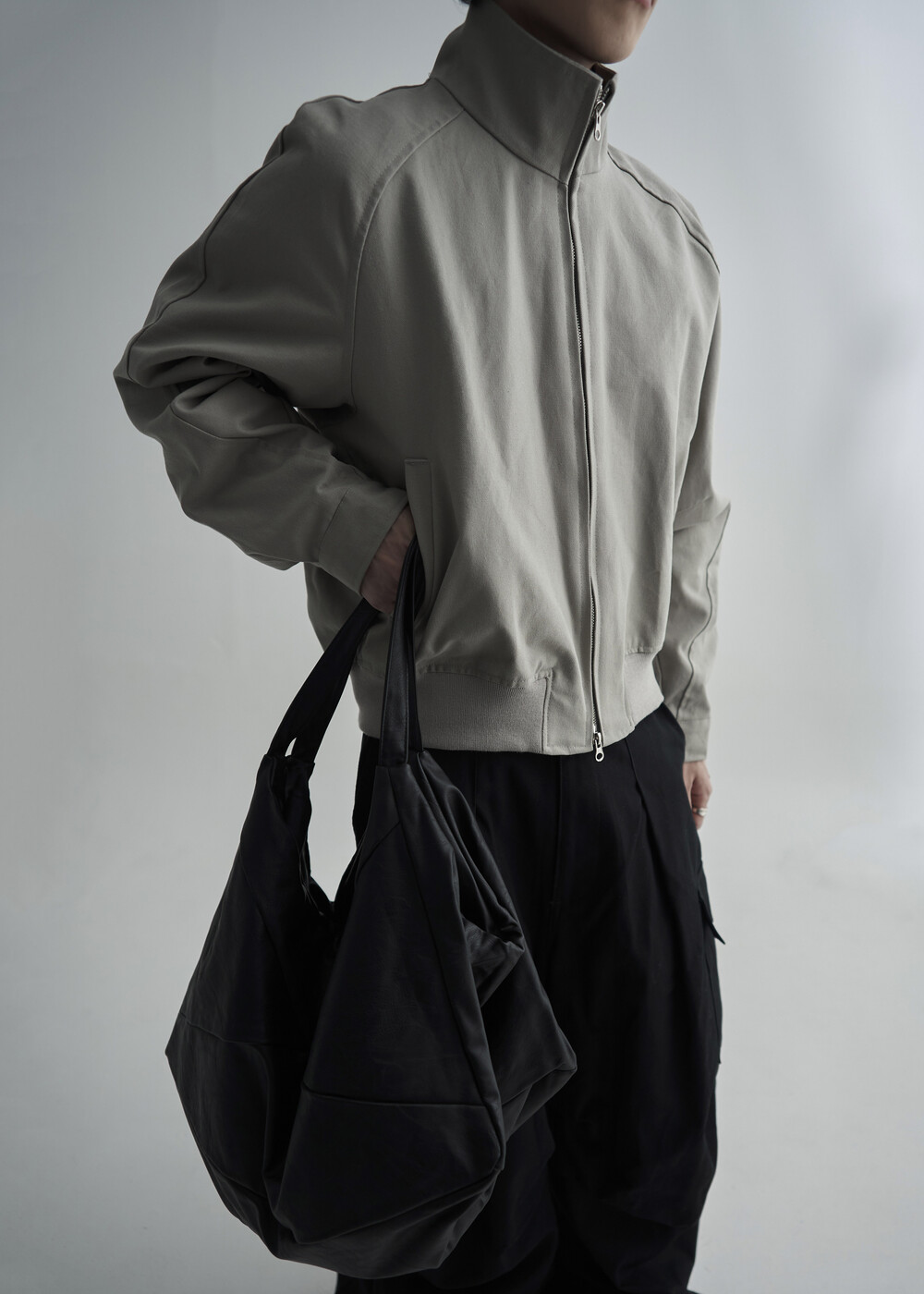 견고한 코튼 소재감으로 편성되어 탄탄한 착용감을 보여주는 하이넥 밴딩 크롭 자켓 제품입니다.