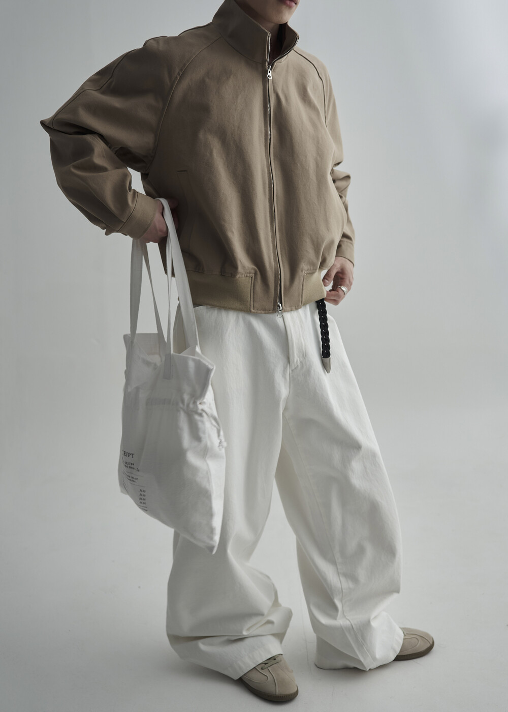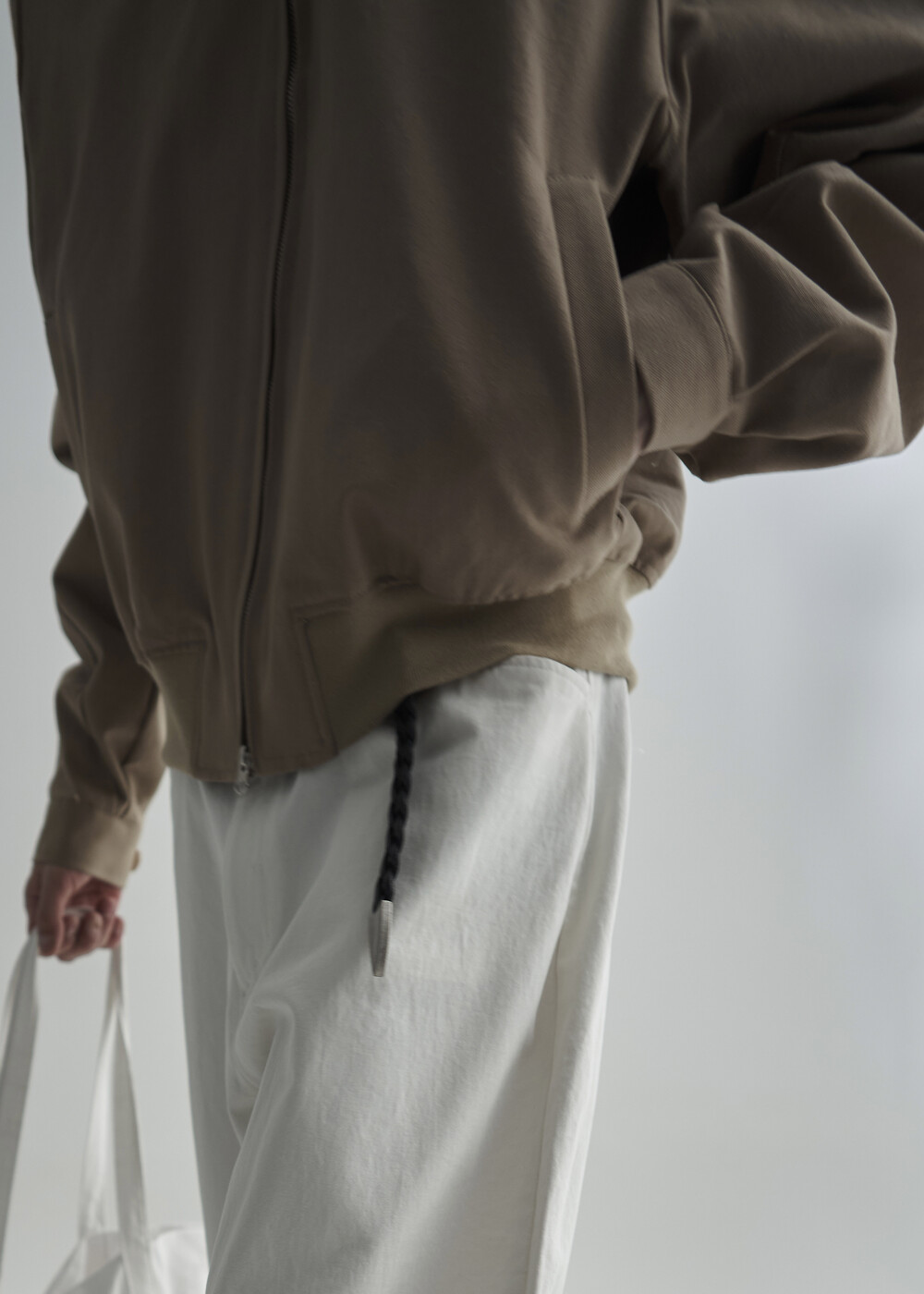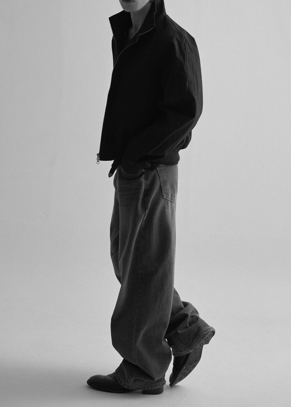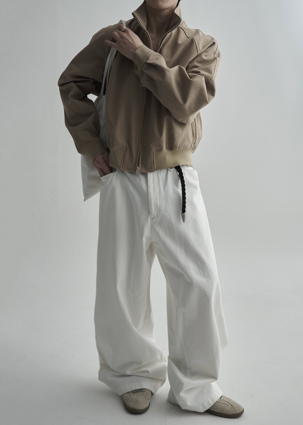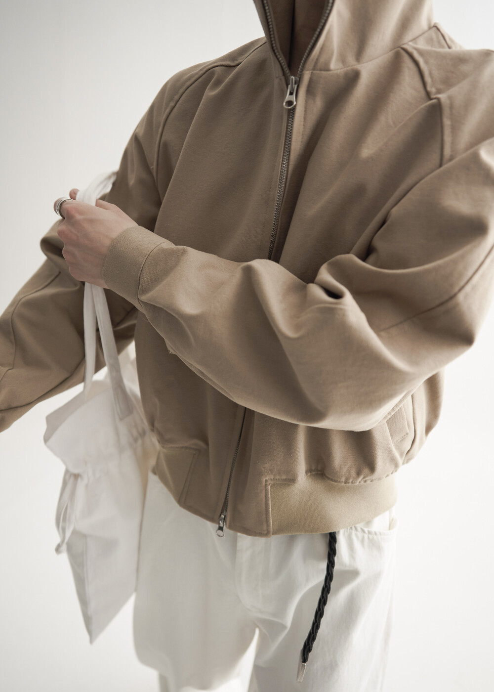 견고한 코튼 소재감으로 편성되어 탄탄한 착용감을 보여주는 하이넥 밴딩 크롭 자켓 제품입니다.