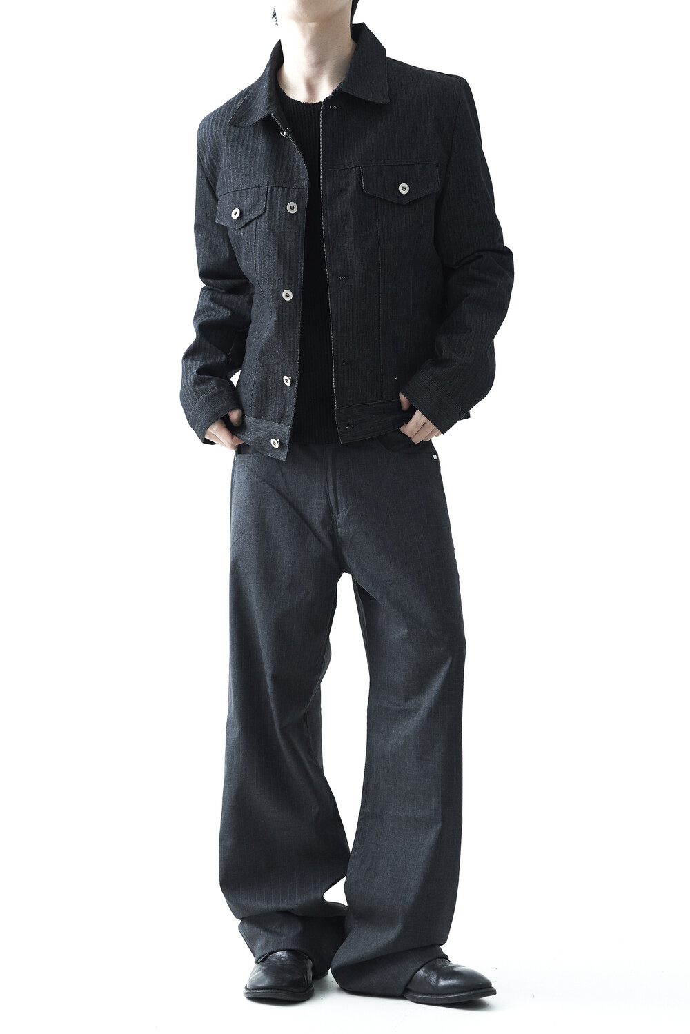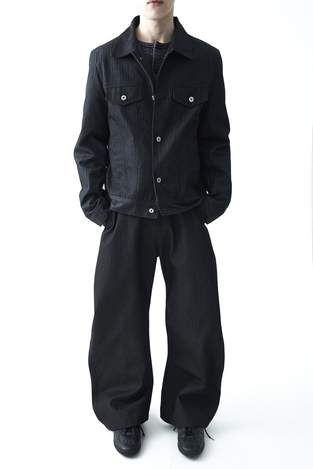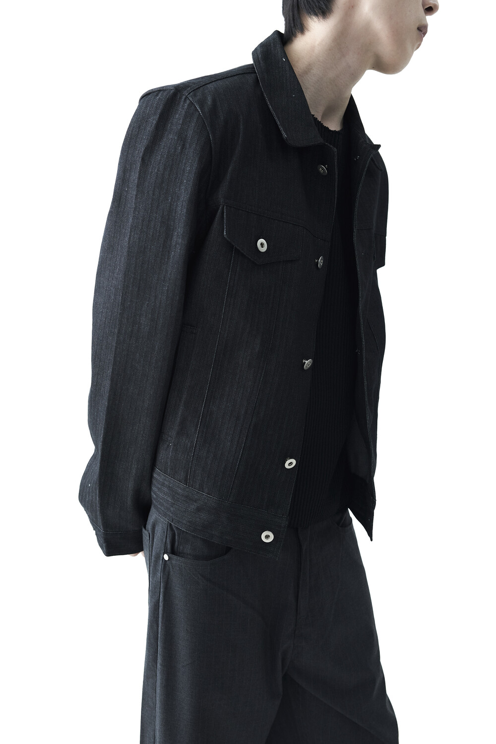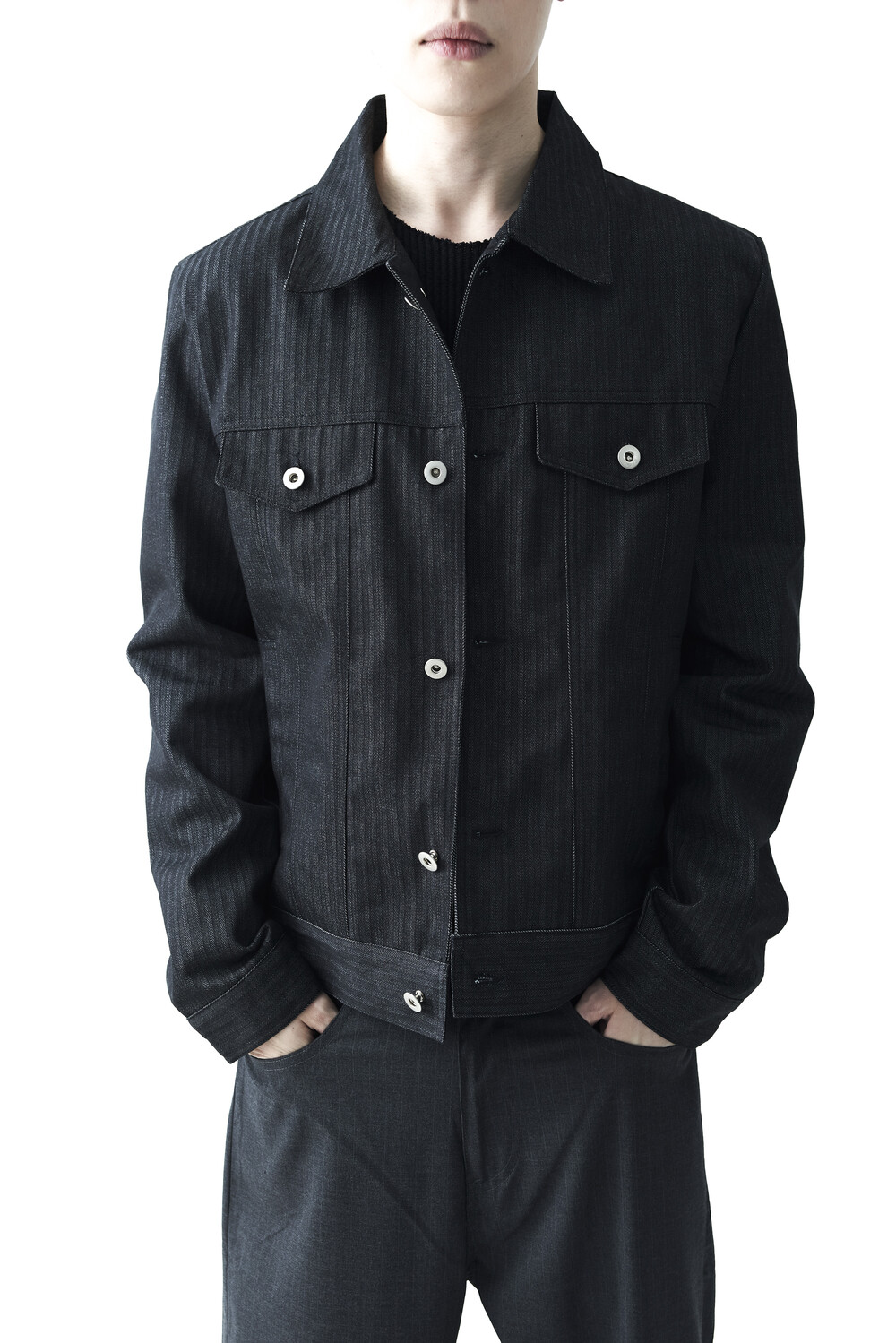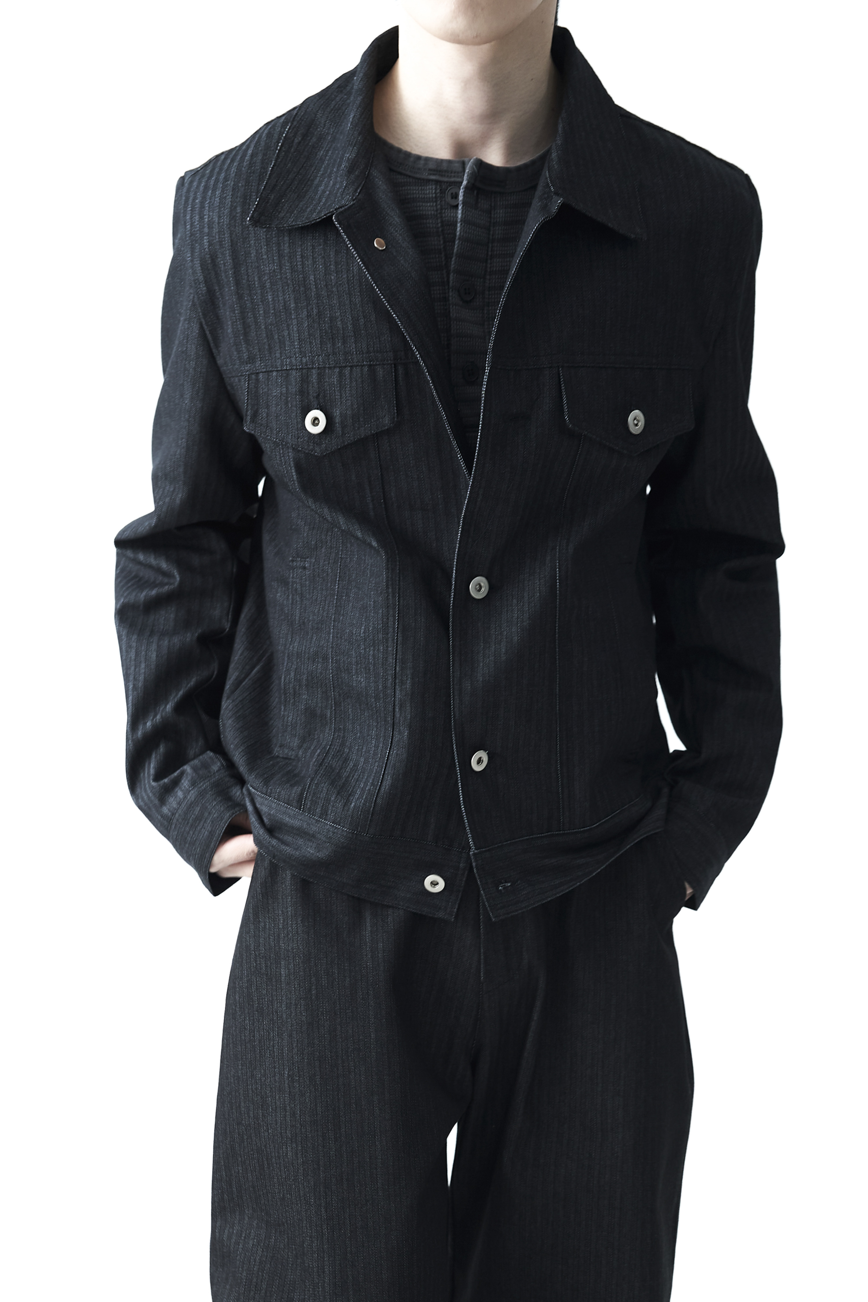 - 헤링본 패턴의 코튼 데님 소재감으로 구성된 크롭 데님 자켓 제품입니다. 단독으로 착용하셔도 유니크한 코디가 가능하며, 동일한 팬츠 제품과 셋업 모두 혼용 가능합니다.