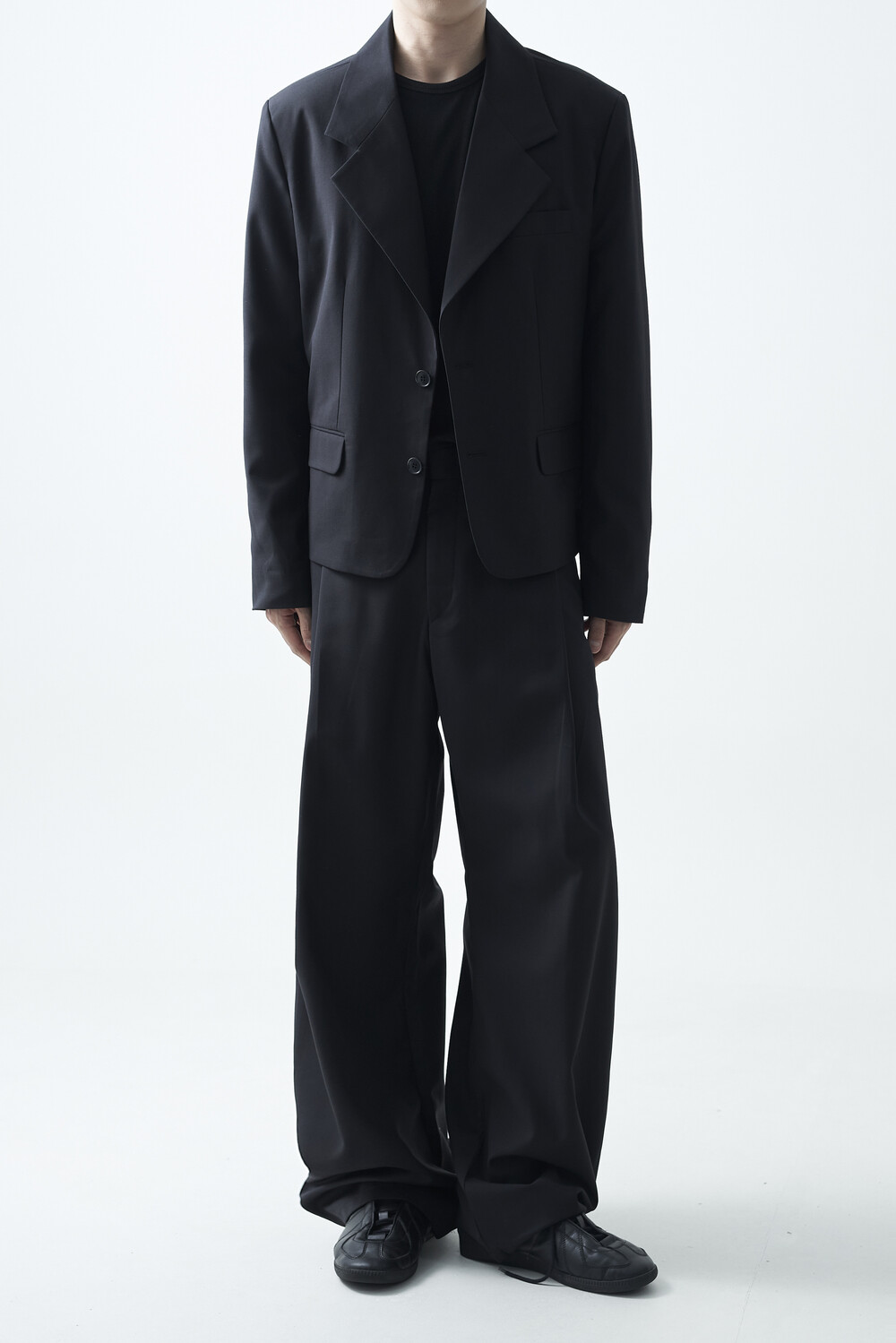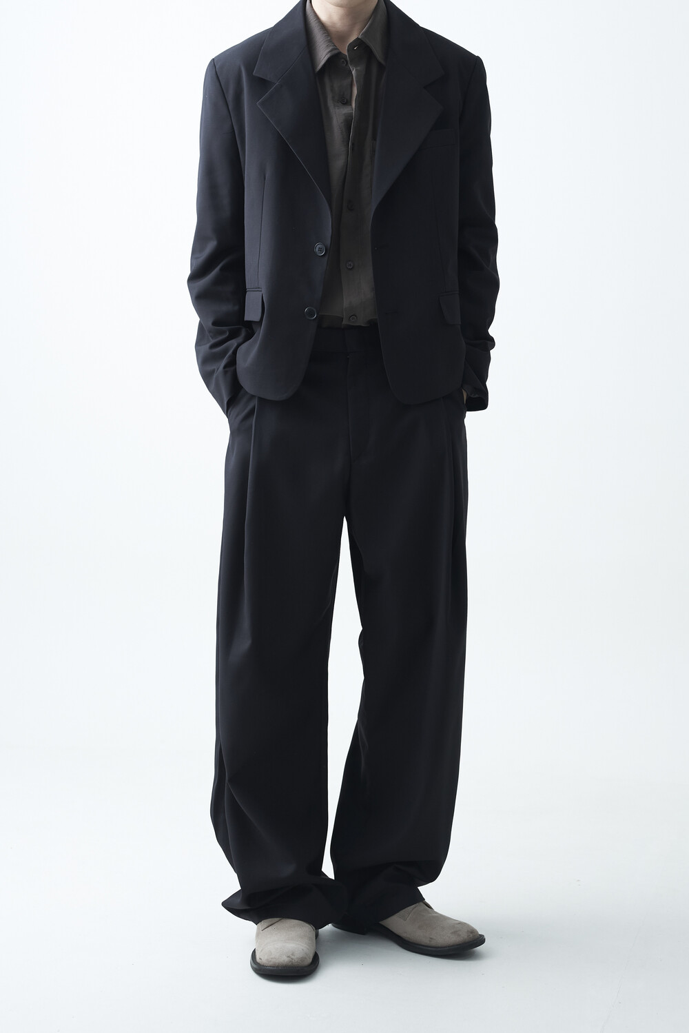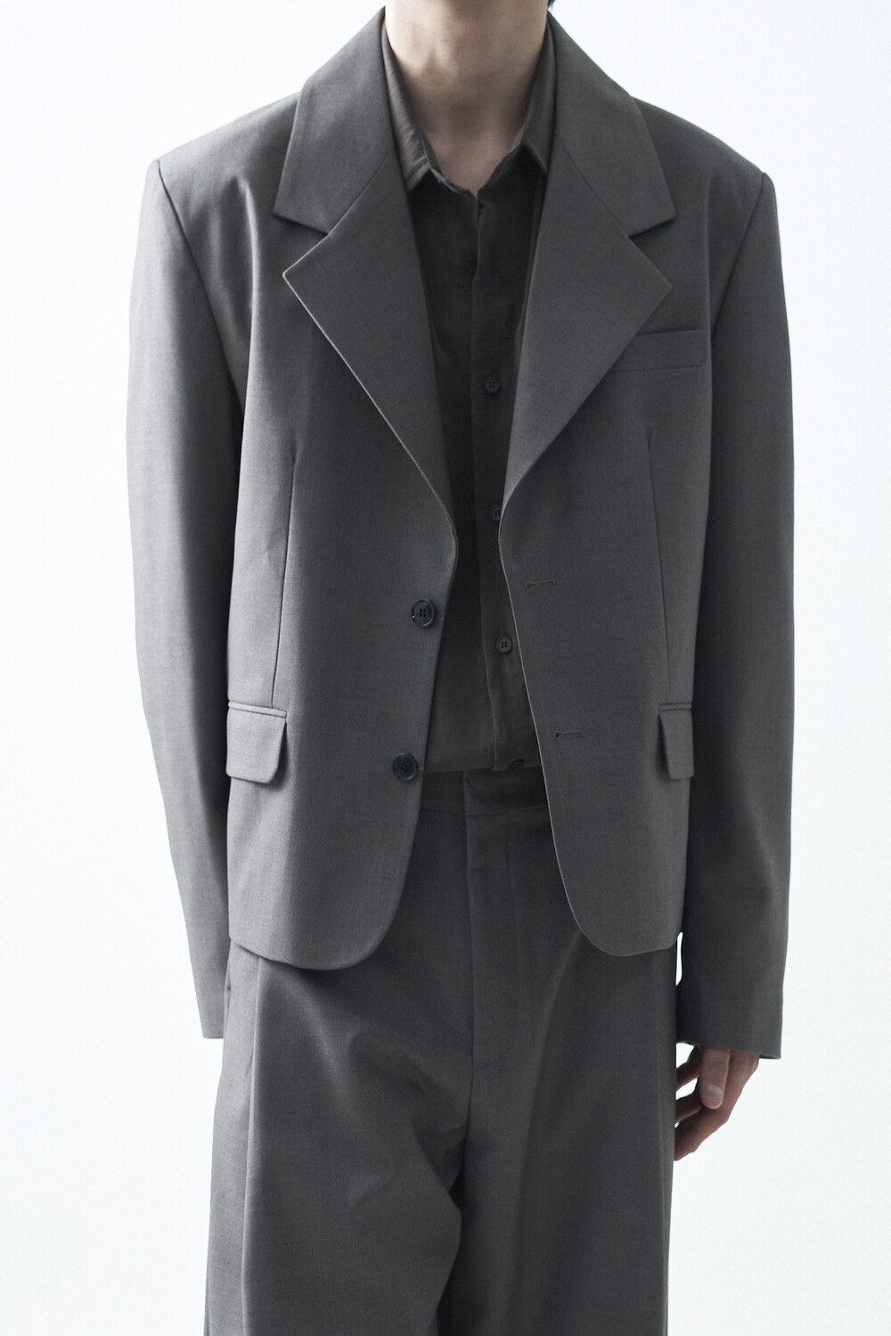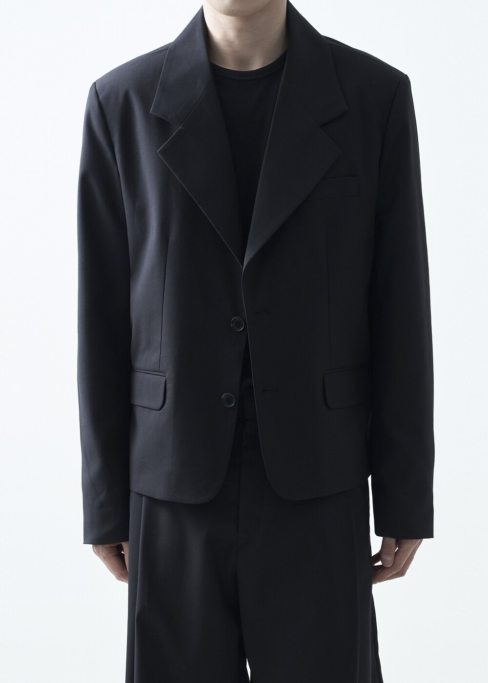 크롭한 기장감와 와이드한 라펠로 유니크한 매력을 보여주는 투버튼 블레이져 자켓 제품입니다. 슬림 크롭핏으로 와이드한 팬츠와 높은 매칭력을 갖췄으며 투포켓/투버튼으로 디테일로 더욱 미니멀한 감성을 더했습니다.