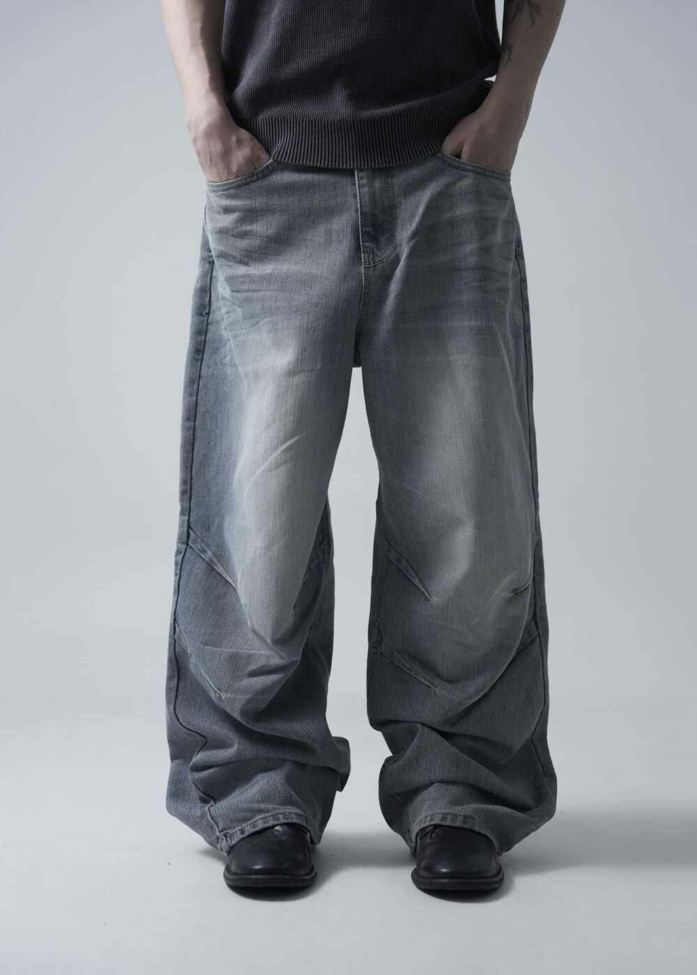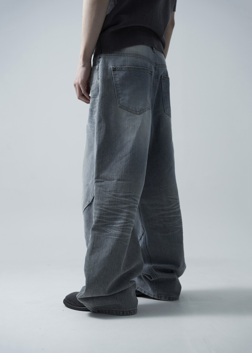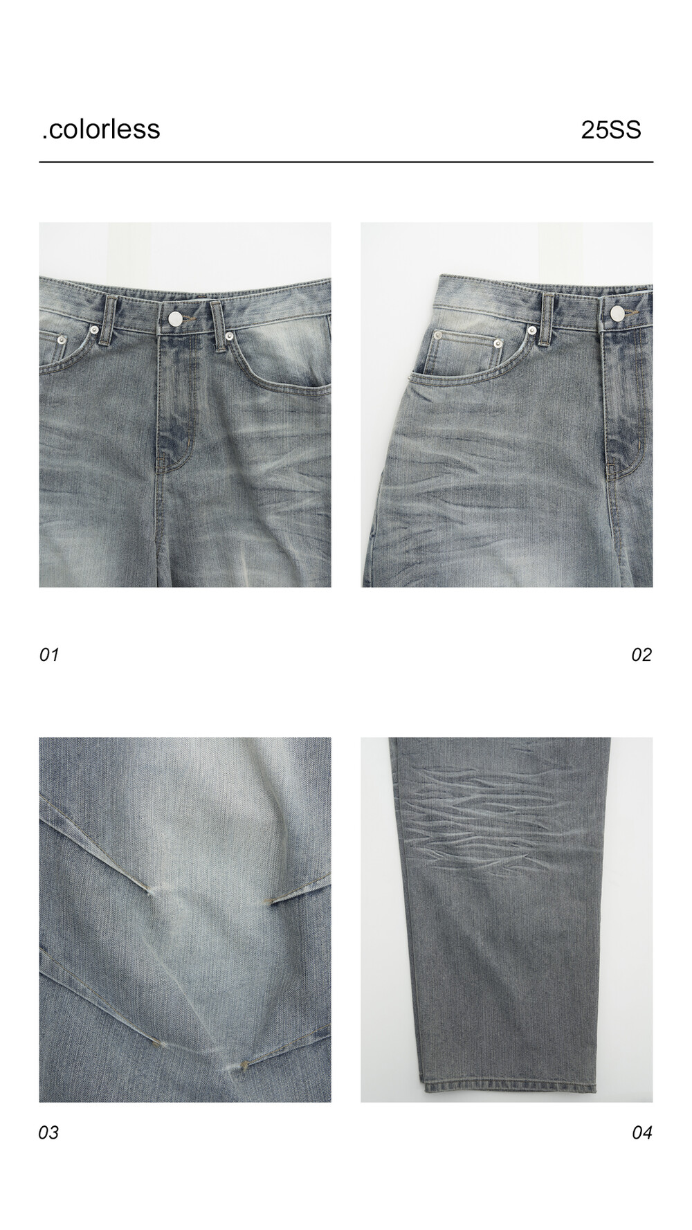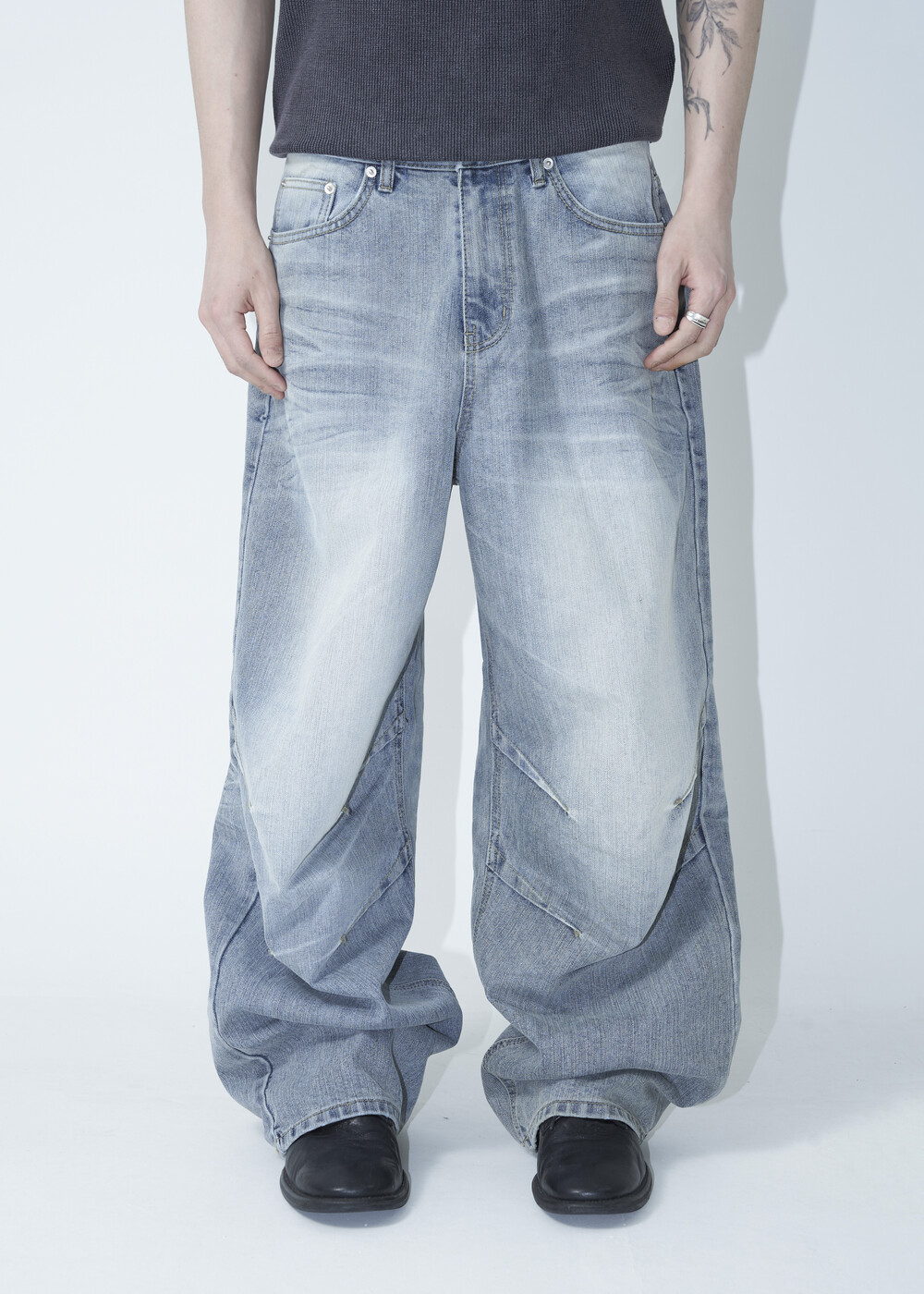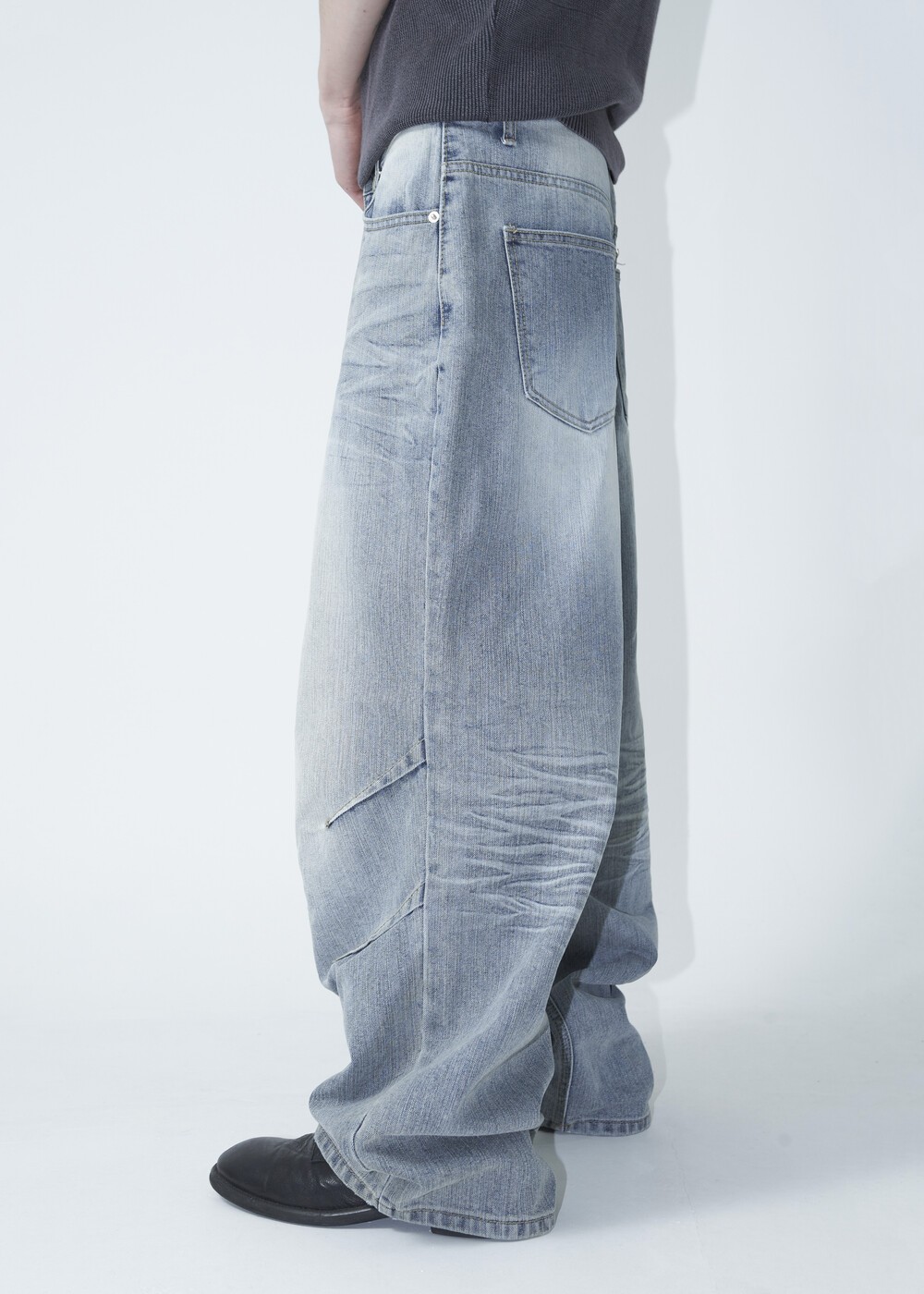 사선으로 깊이 들어오는 다트 디테일이 매력적인 그레이 컬러감의 벌룬 와이드 데님 제품입니다. 전-후면부의 물결과 같은 디테일이 트렌디하게 적용되었으며, 여유로운 벌룬와이드 실루엣을 연출합니다.