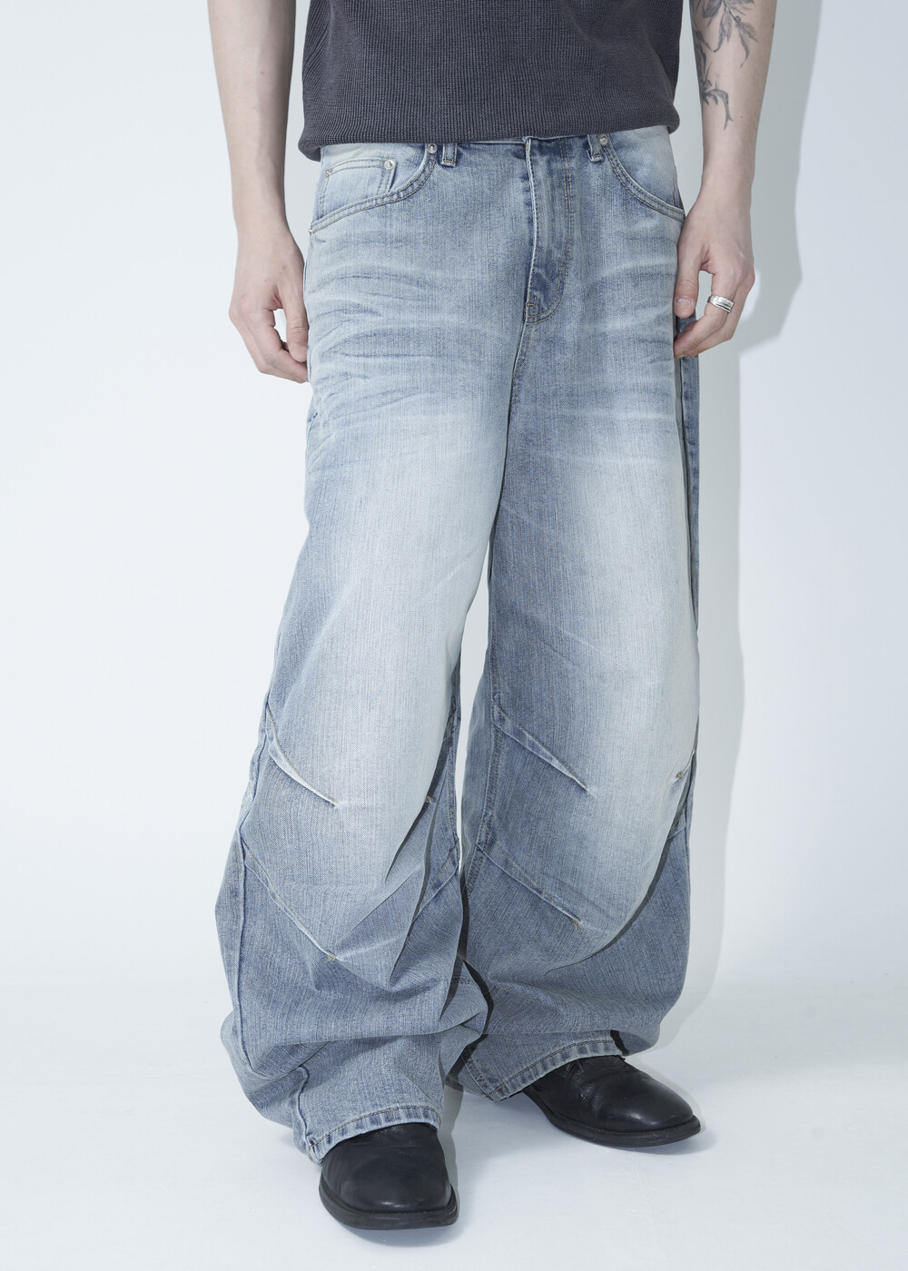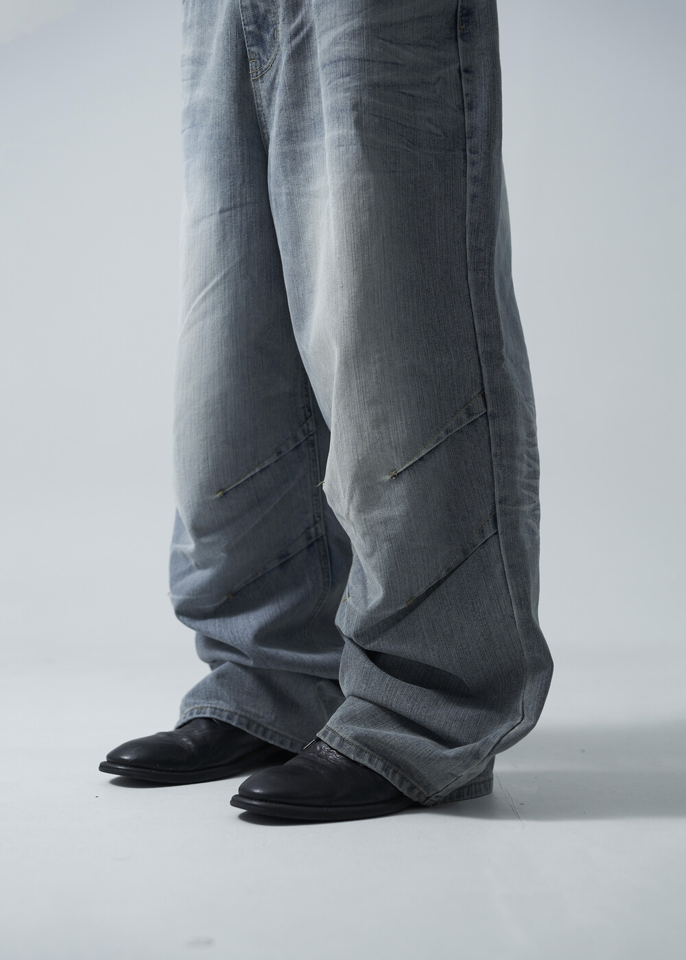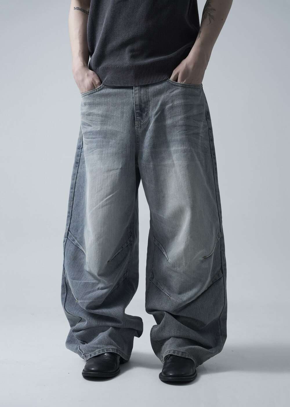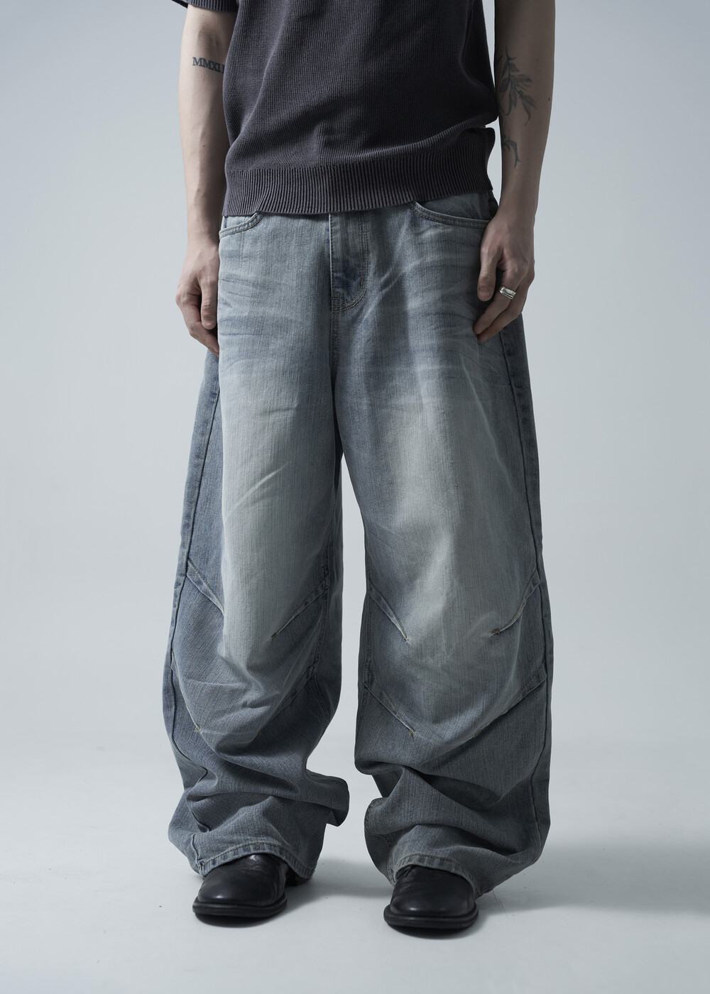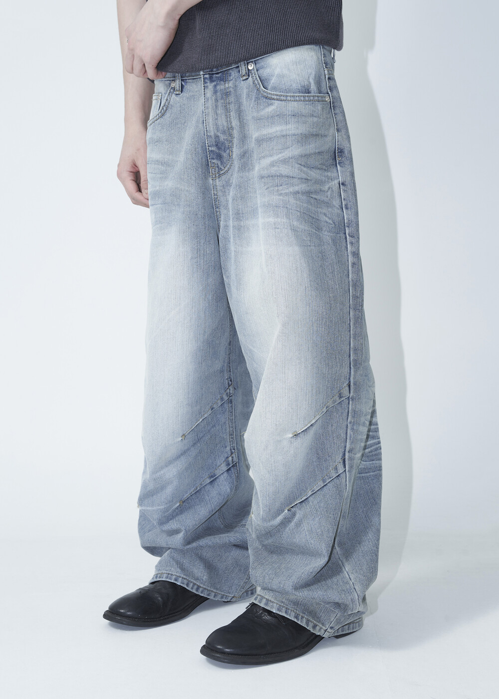 사선으로 깊이 들어오는 다트 디테일이 매력적인 그레이 컬러감의 벌룬 와이드 데님 제품입니다. 전-후면부의 물결과 같은 디테일이 트렌디하게 적용되었으며, 여유로운 벌룬와이드 실루엣을 연출합니다.