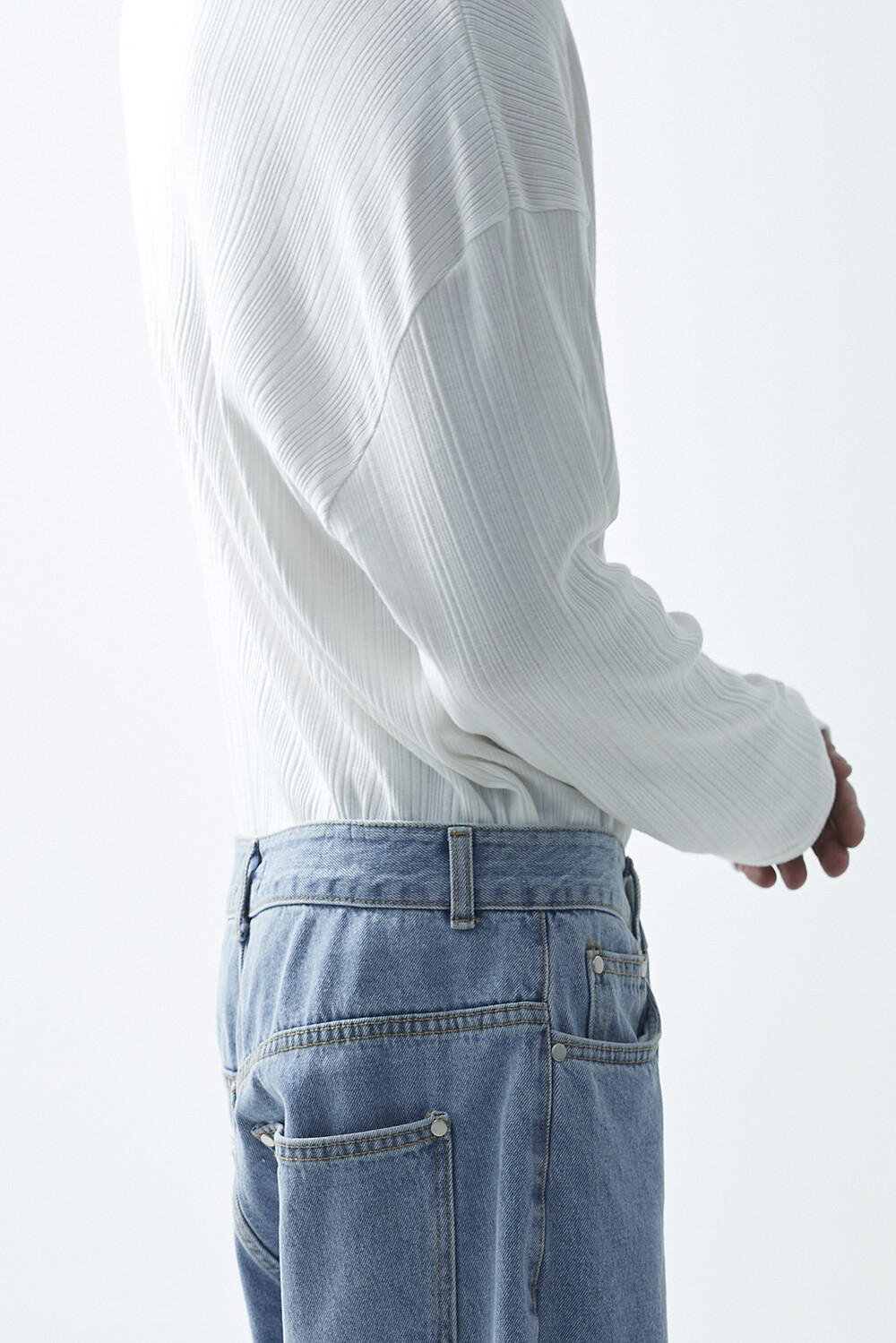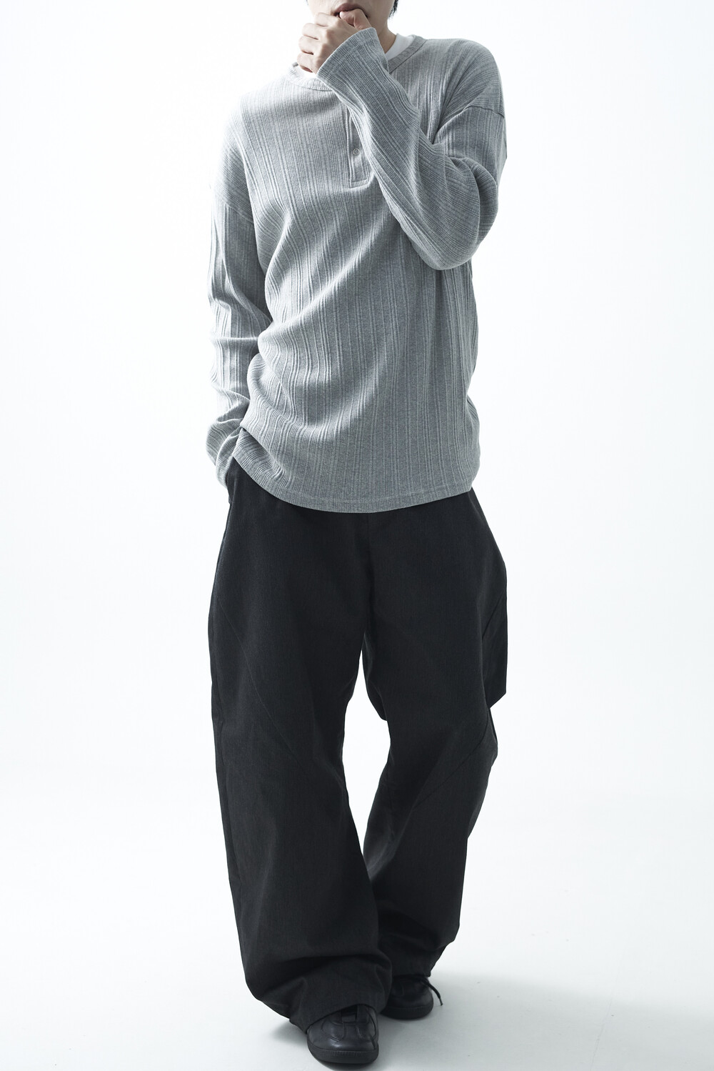 착용 시 몸을 자연스럽게 감싸주는 착용감과 비침이 없는 폴리코튼 소재감을 사용했으며, 취향에 따라 넥 라인 오픈의 정도를 조절할 수 있어 편리합니다. 계절에 따라 단품 착용으로는 가을 내내 착용 가능하며 겨울 시즌에는 이너로도 높은 활용도를 가집니다. 제품 전체적으로 스트라이프 느낌의 골지 텍스쳐가 함께 추가되어 더욱 입체적인 연출이 가능한 티셔츠 제품입니다.